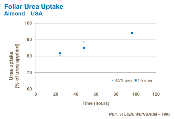 Almonds are among the most efficient crops in terms of nitrogen uptake. Research in California shows that 70% or more of the applied nitrogen ends up in the almond tree.