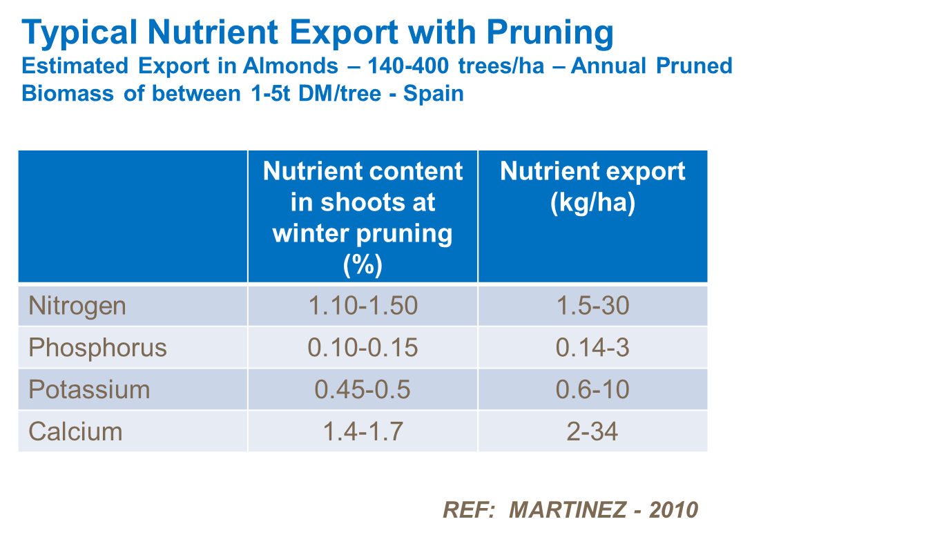 Between 8.5 and 50kg nitrogen is removed for every tonne of nuts harvested. This varies according to nut type; almond is the most N-demanding nut tree species.
