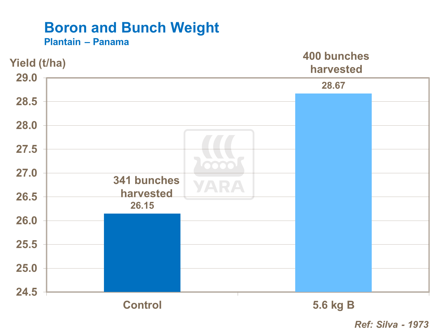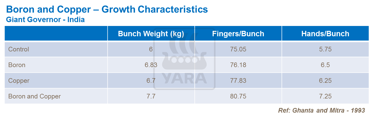 Trails examining the role of boron (some in association with copper), show that both micronutrients have a positive effect on growth, leading to increases in banana bunch weight. If boron is deficient it would lead to a poor bunch development.