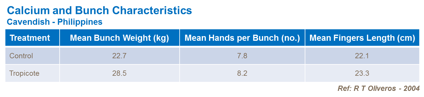Magnesium has a direct effect on bunch weight. If deficient, plant growth will suffer, potassium and calcium uptake would decline and the overall banana yield would be poor.
