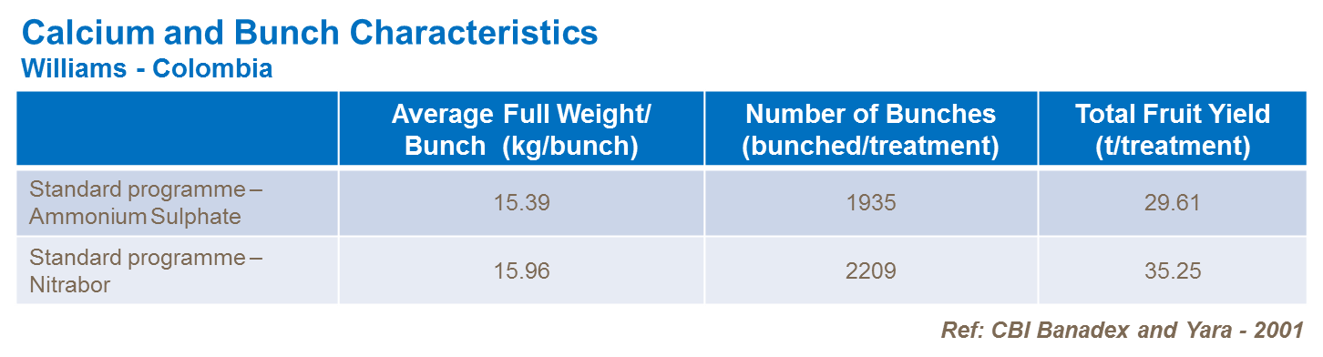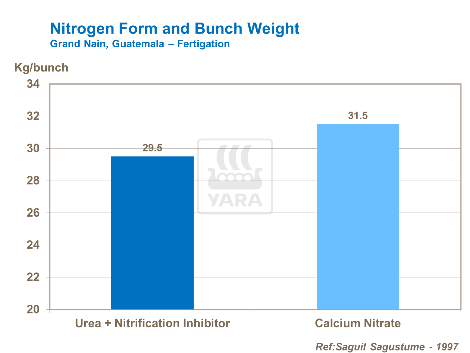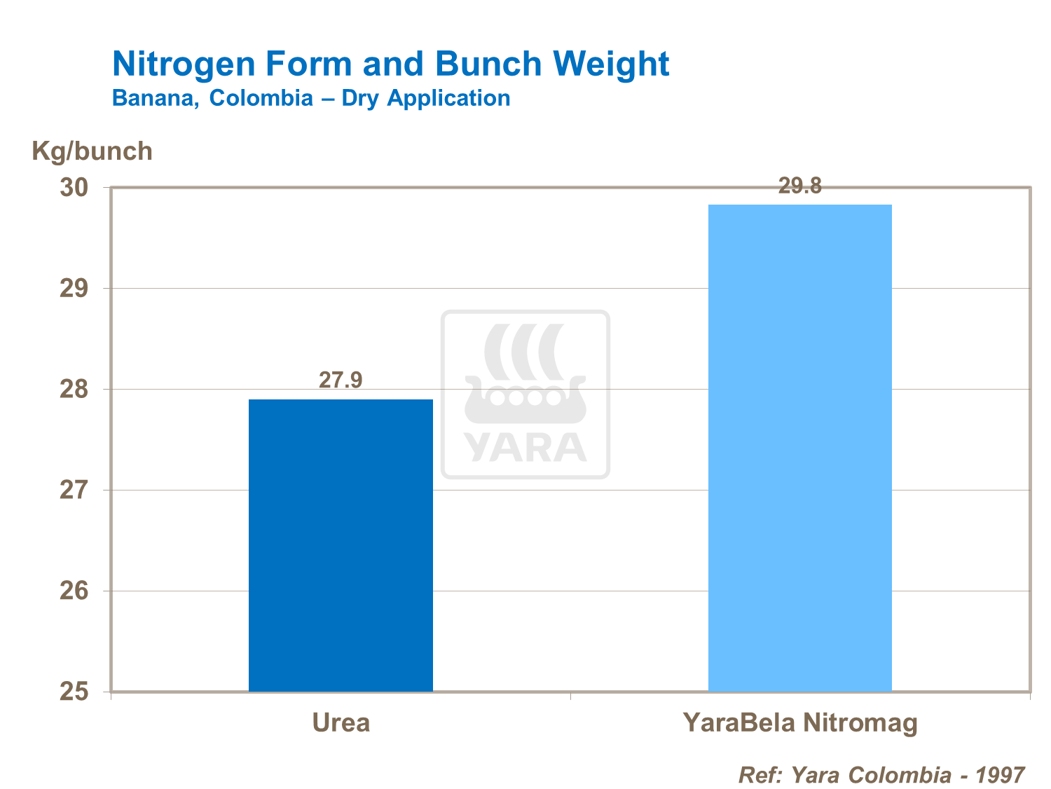 Trials confirm that where nitrate-nitrogen sources are predominantly used, banana bunch weights are higher.