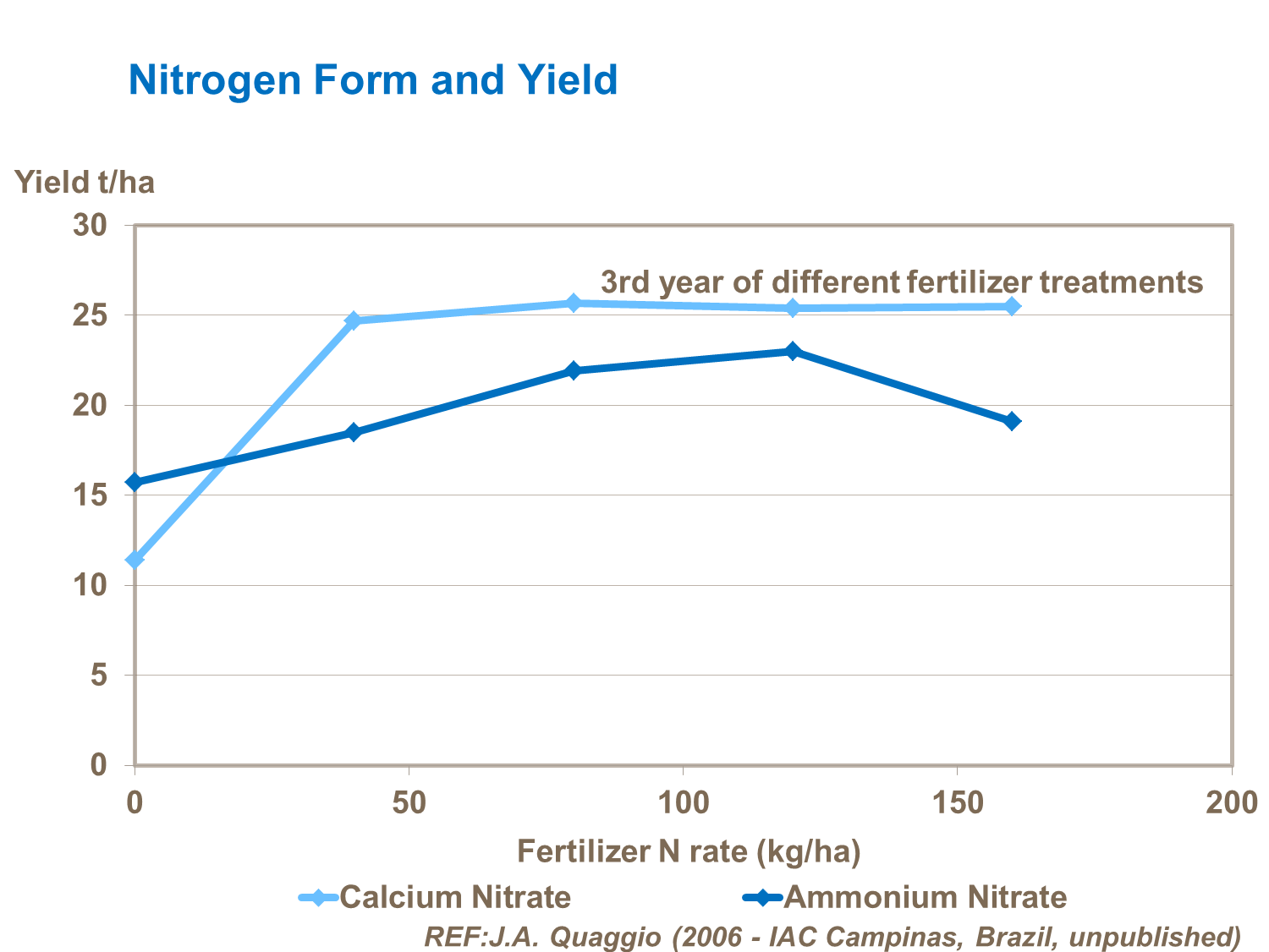 Highest yields have been recorded where nitrogen is applied as calcium nitrate rather than as ammonium nitrate.