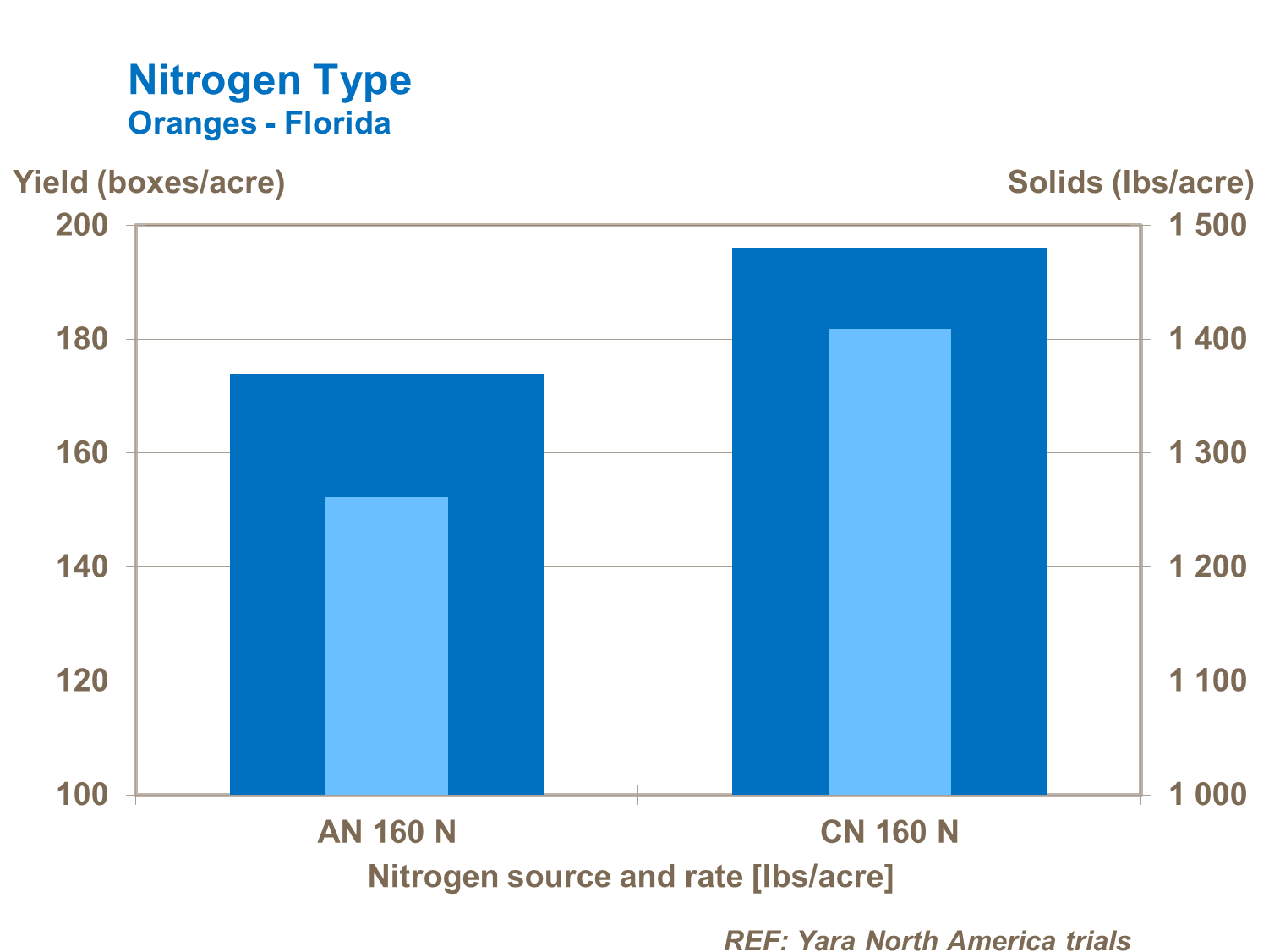 Citrus utilizes nitrogen mostly in the nitrate form and maximum uptake occurs from N applications made during the periods of active growth.