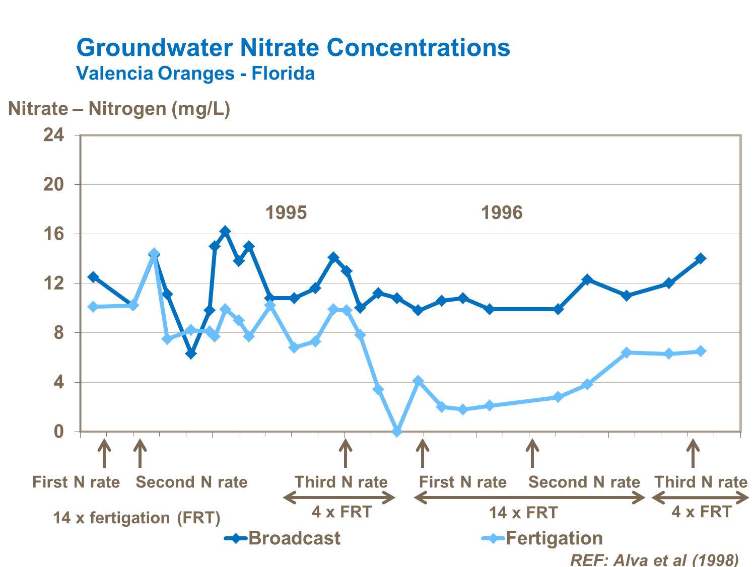 - Application of nitrate nitrogen in irrigation water, at key periods such as leaf flush, can ensure immediate availability and stronger growth. Good management practices can minimize nitrate leaching compared to broadcast applications.