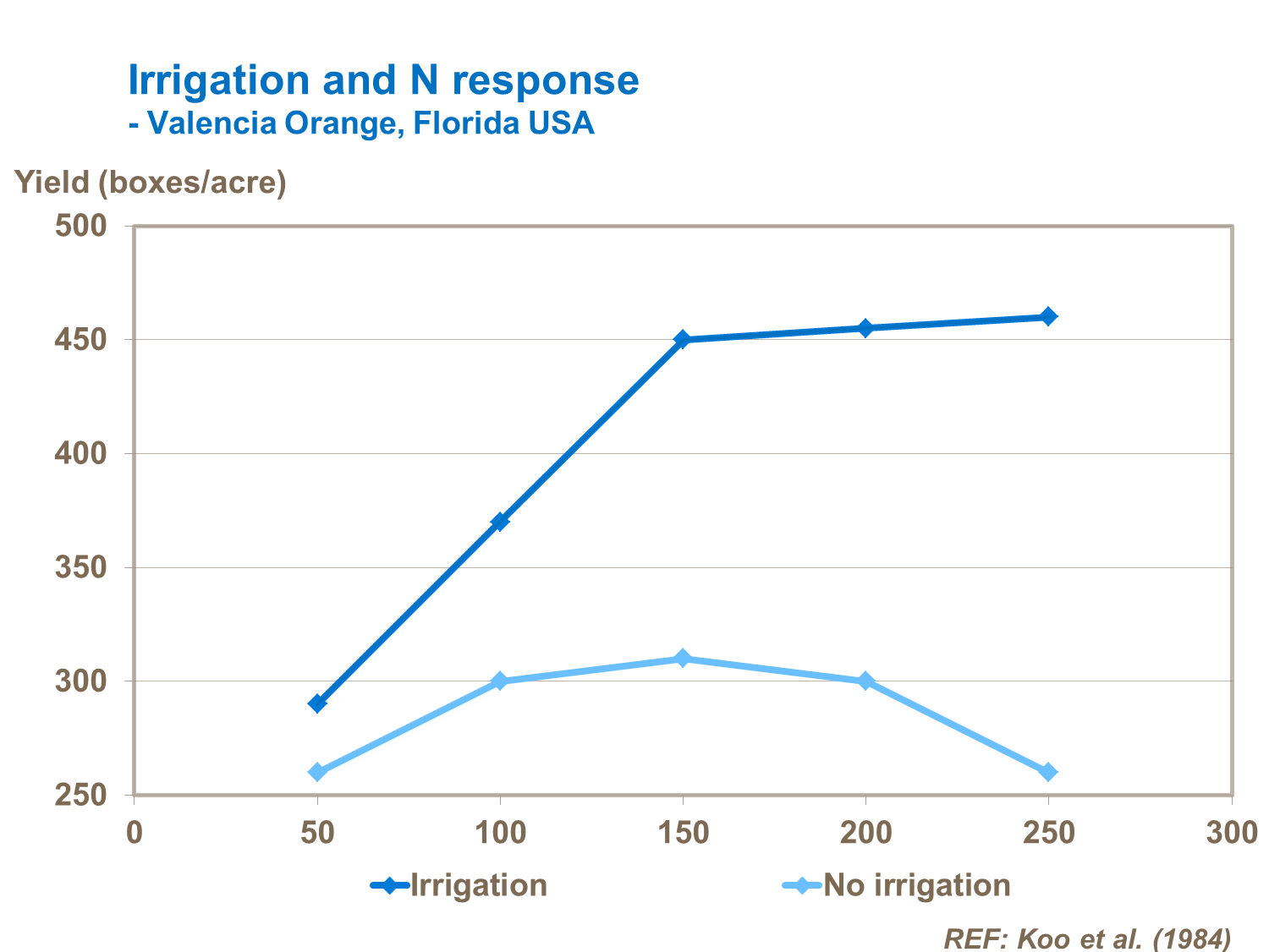 Correct use of irrigation also ensures better utilization of nitrogen. Work on Valencia oranges in Florida, shows that an irrigated crop can use more nitrogen, increasing yields.