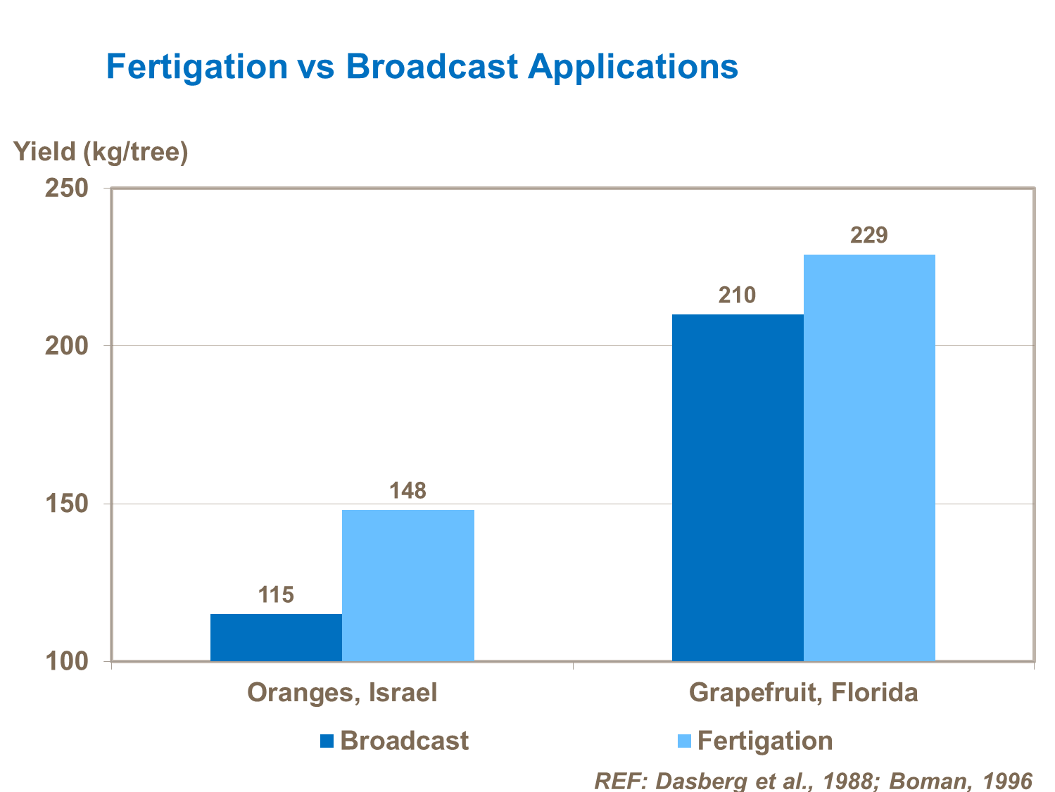 Fertigation can also help ensure maximum N-utilization, providing higher yields compared to broadcasting solid fertilizer-N.