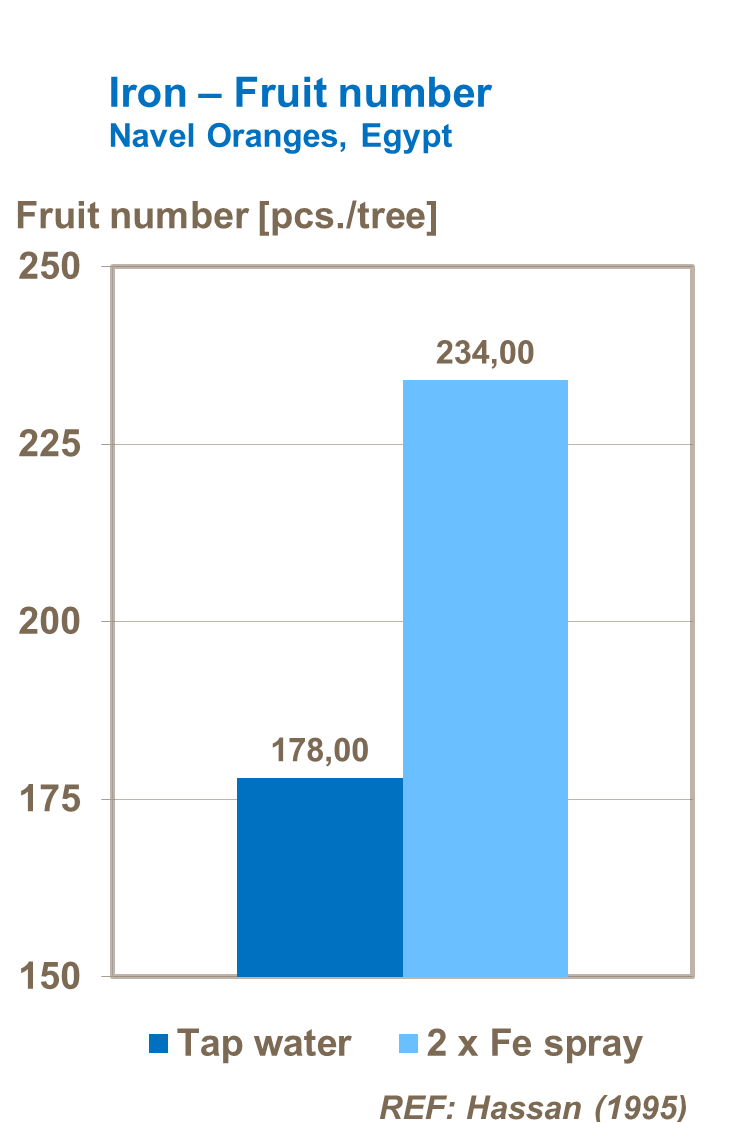 Iron also has a direct effect on crop quality improving the levels of total soluble solids in oranges and mandarins as well as increasing the TSS/Acidity ratio.