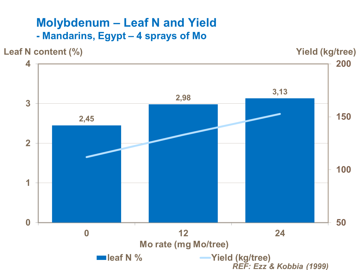 In trials carried out in Egypt, nitrate reductase activity increased with increasing rates of Mo. It was demonstrated that 6mg/tree of molybdenum improved mandarin yields by 44% and helped increase leaf-N contents.