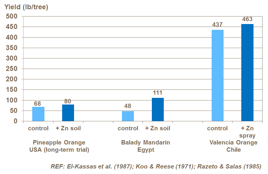 Soil and foliar applications are both effective in increasing yield. In some studies in oranges and grapefruit, researchers have also reported increases in juice content from use of Zn.