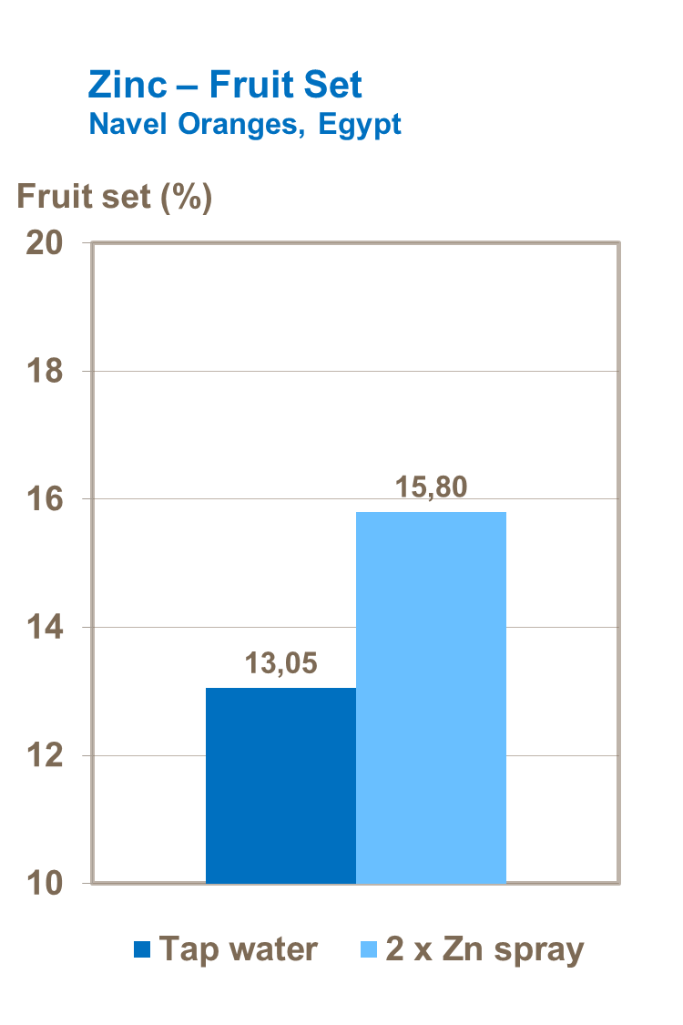 Zinc deficiency significantly reduces growth and yield potential. Low zinc levels reduce fruit number per tree, as trials with navel oranges in Egypt show.