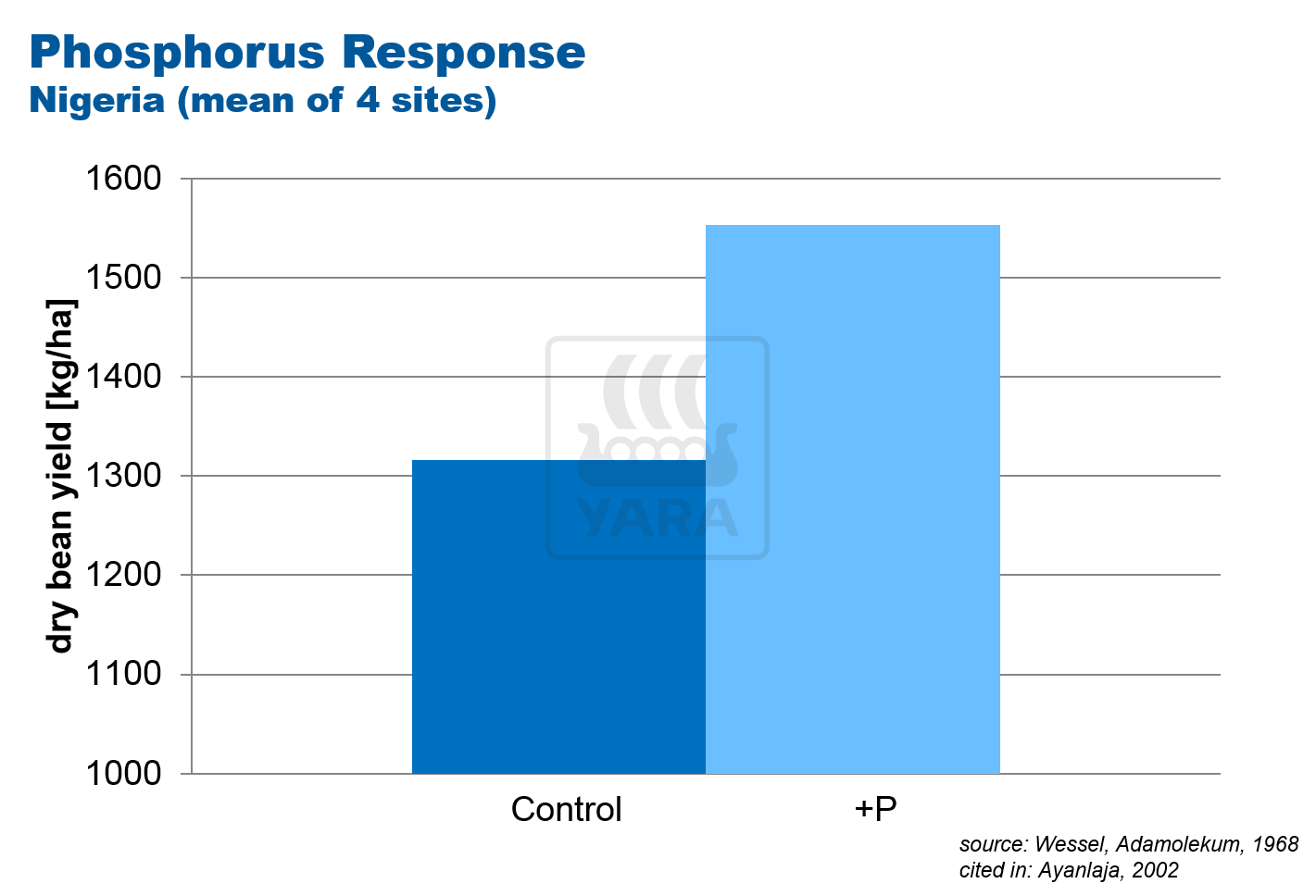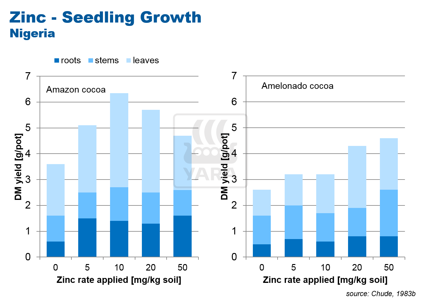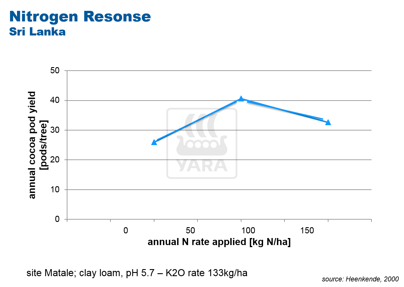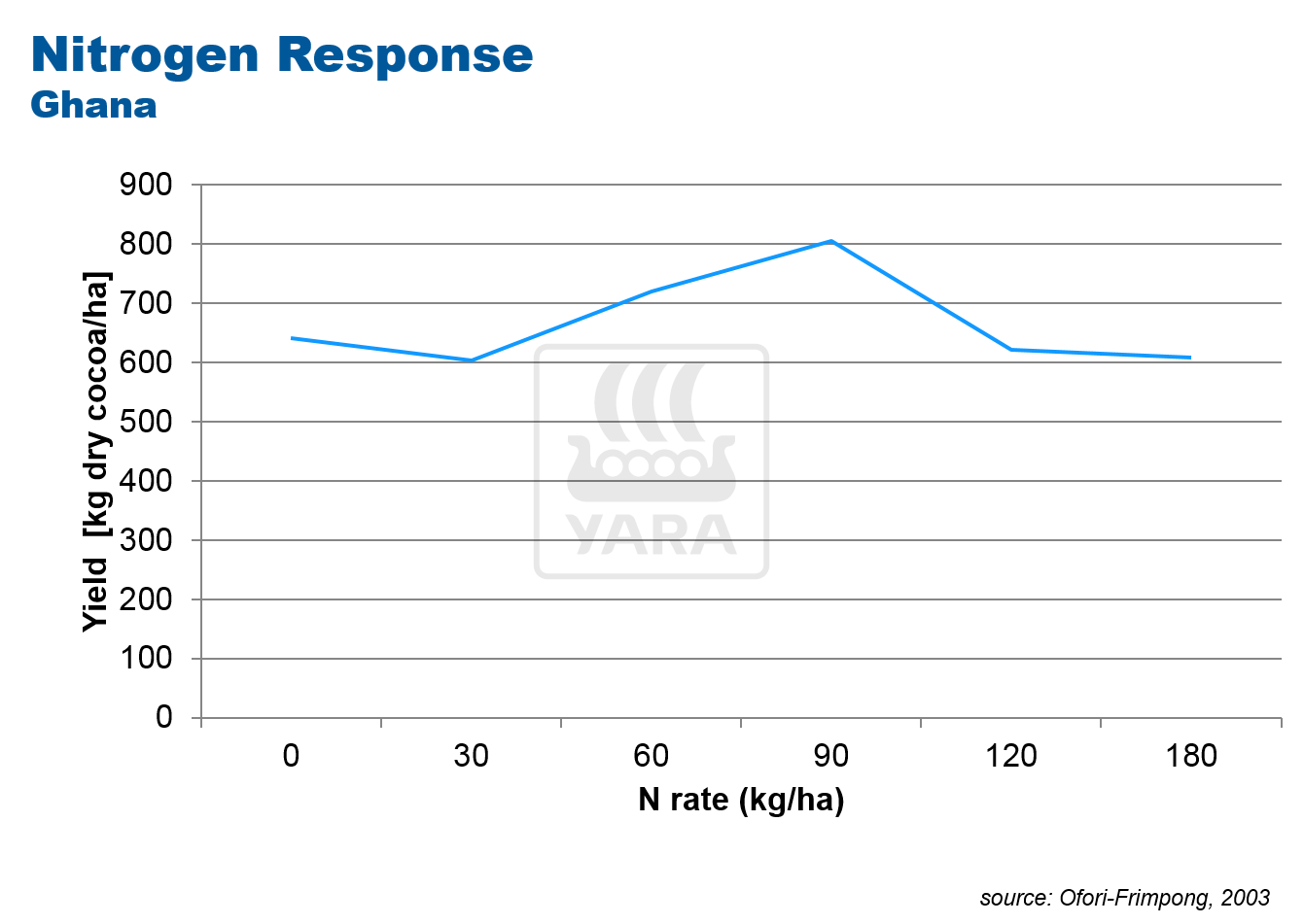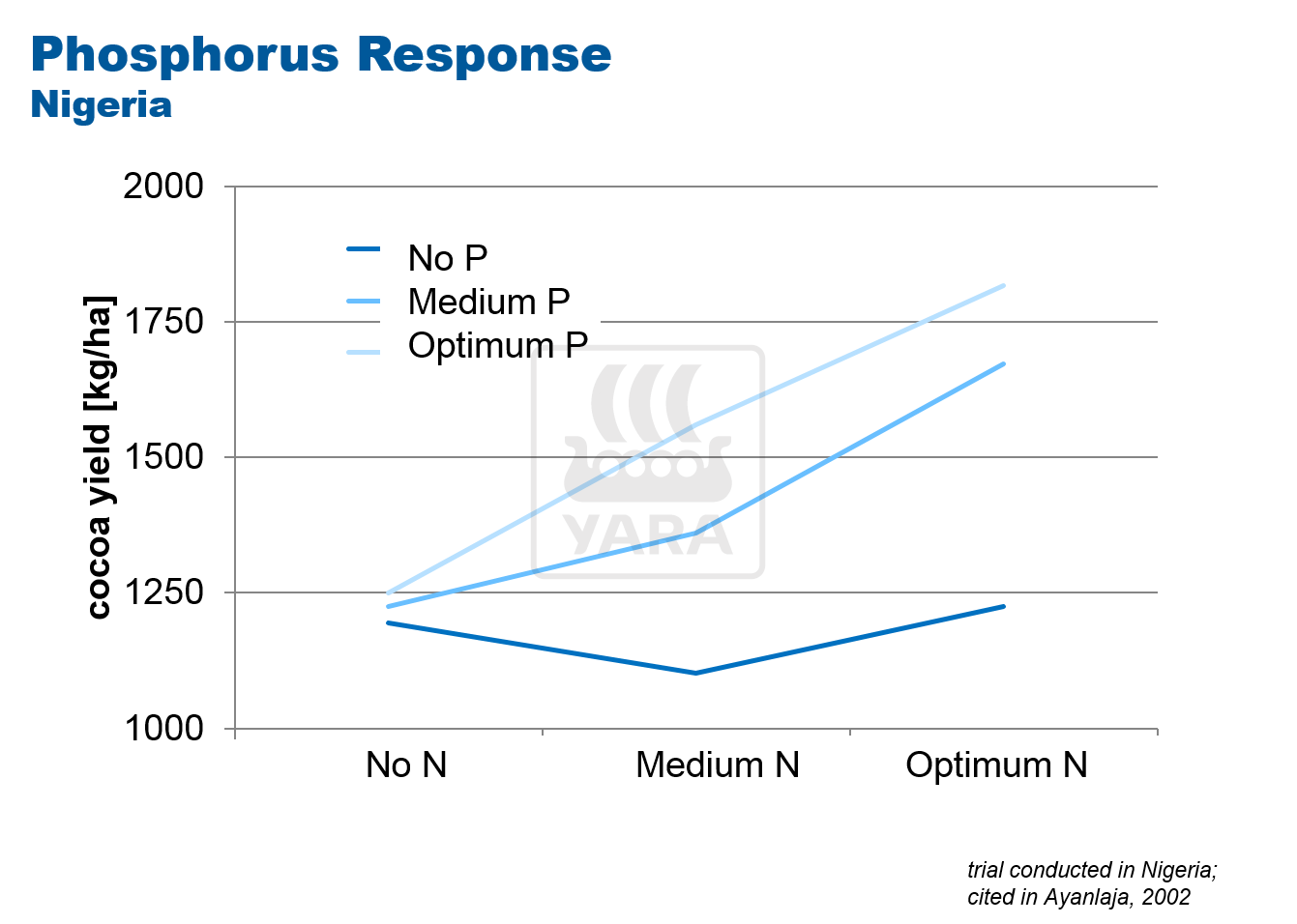 Traditionally, cocoa crops have been grown without fertilizer, relying on the nutrient provided by compost. This often over-supplies nitrogen and leads to poor availability of other nutrients such as phosphorus, potassium and calcium, which are needed for effective cocoa growth. For this reason nitrogen-response trials often show little increase in cocoa yield response .