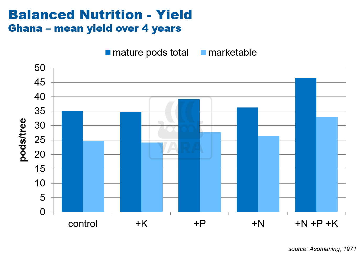 Responses are higher when all nutrients are in balance and available in significant quantities. For example under a high potassium regime, the trees will respond to higher nitrogen inputs to fulfil their higher cocoa yield potential.
