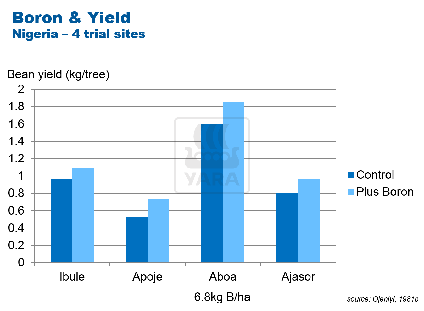 Boron is commonly applied alongside calcium in cocoa and helps to move calcium through the plant. As a result, by getting both boron and calcium to developing tissues, flower set is stronger, and pods are more strongly held on the tree (less pod drop). After application to the soil, boron can provide positive cocoa yield increases.