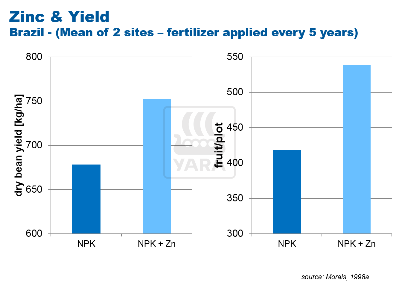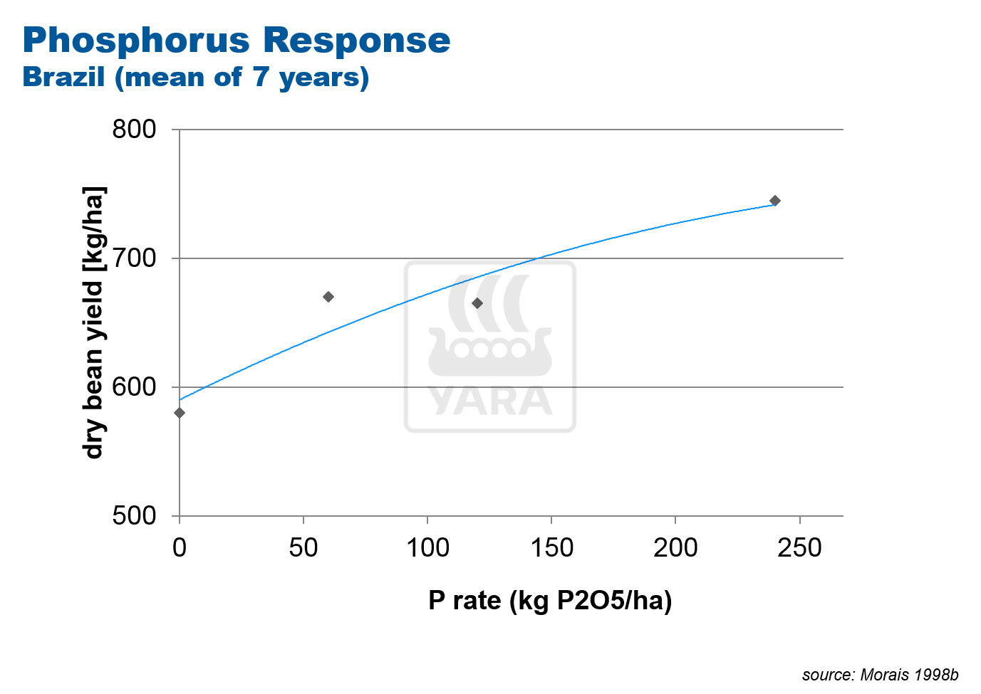 Continued annual use helps improve yields. Applications up to 200kg/ha of P2O5, significantly above uptake levels, have provided positive yield responses in trials on low P index soils. They may not be economic in the majority of cases.