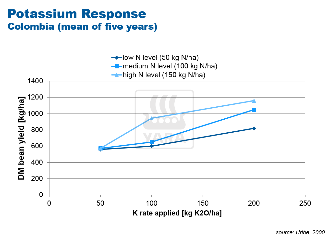 Response curves commonly show large responses to high rates of potassium from rates of 150-200kg K2O/ha. However, for a target yield of less than 1 tonne of beans per hectare, 70-100 kg K2O should be considered as a sufficient rate in a balanced nutrition situation.