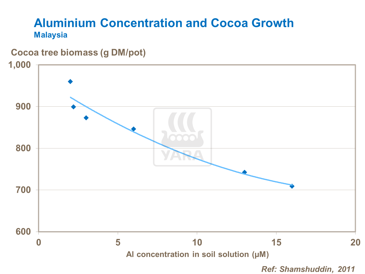When the soil pH drops below 5.5, magnesium, calcium, phosphorus and molybdenum availability drops. At pH levels above 7.5, zinc, manganese and iron can become deficient. Cocoa has low tolerance to high concentrations of aluminum and, as a consequence, once pH drops below 4.5, dry matter production declines. Base saturation should be at least 50- 60%. The optimum exchangeable bases as a percentage of the total should be about K:Ca:Mg = 8:68:24.