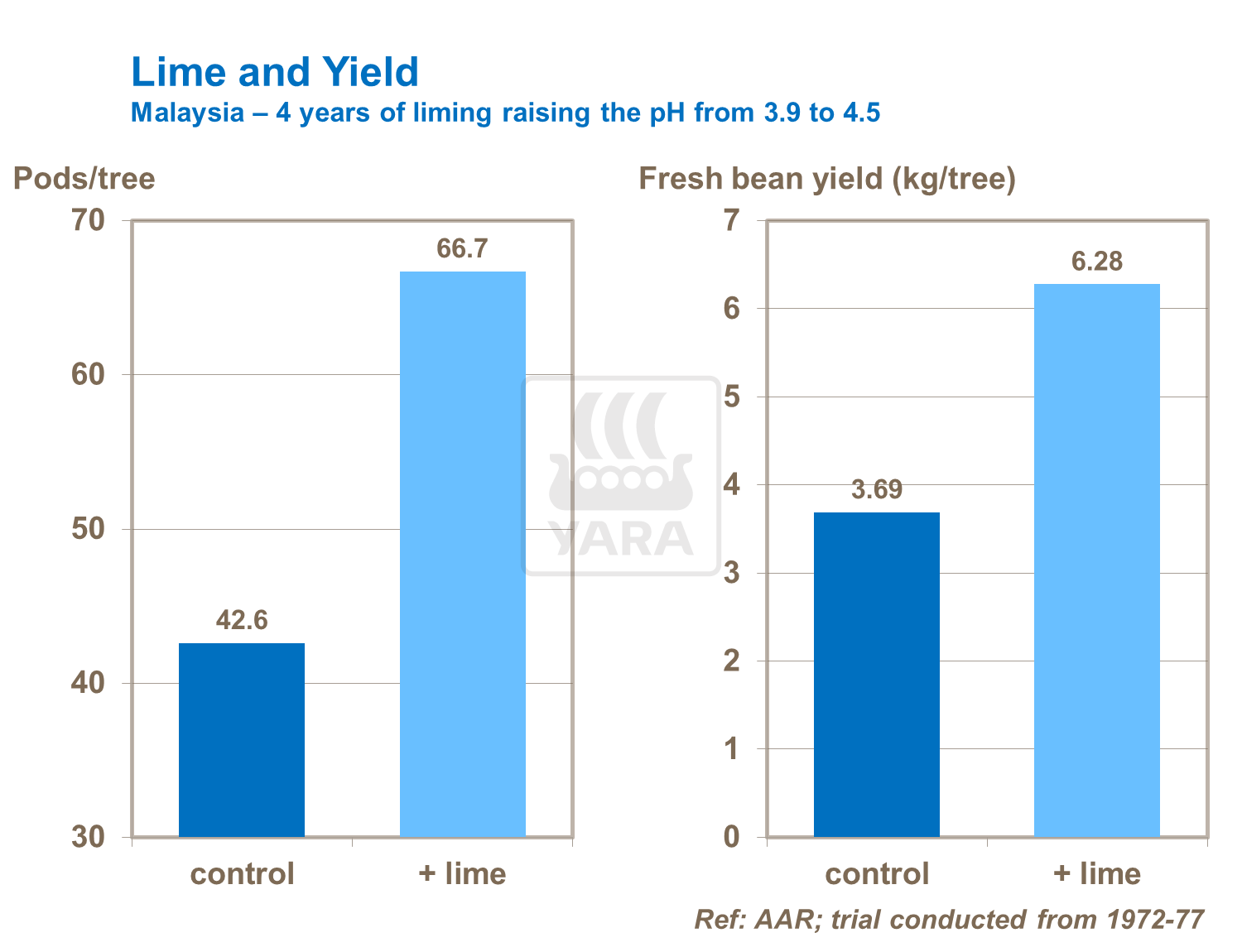 In trials, use of lime has been shown to improve growth, increase the number of pods per tree and produce up to a 70% increase in fresh bean yield/tree.