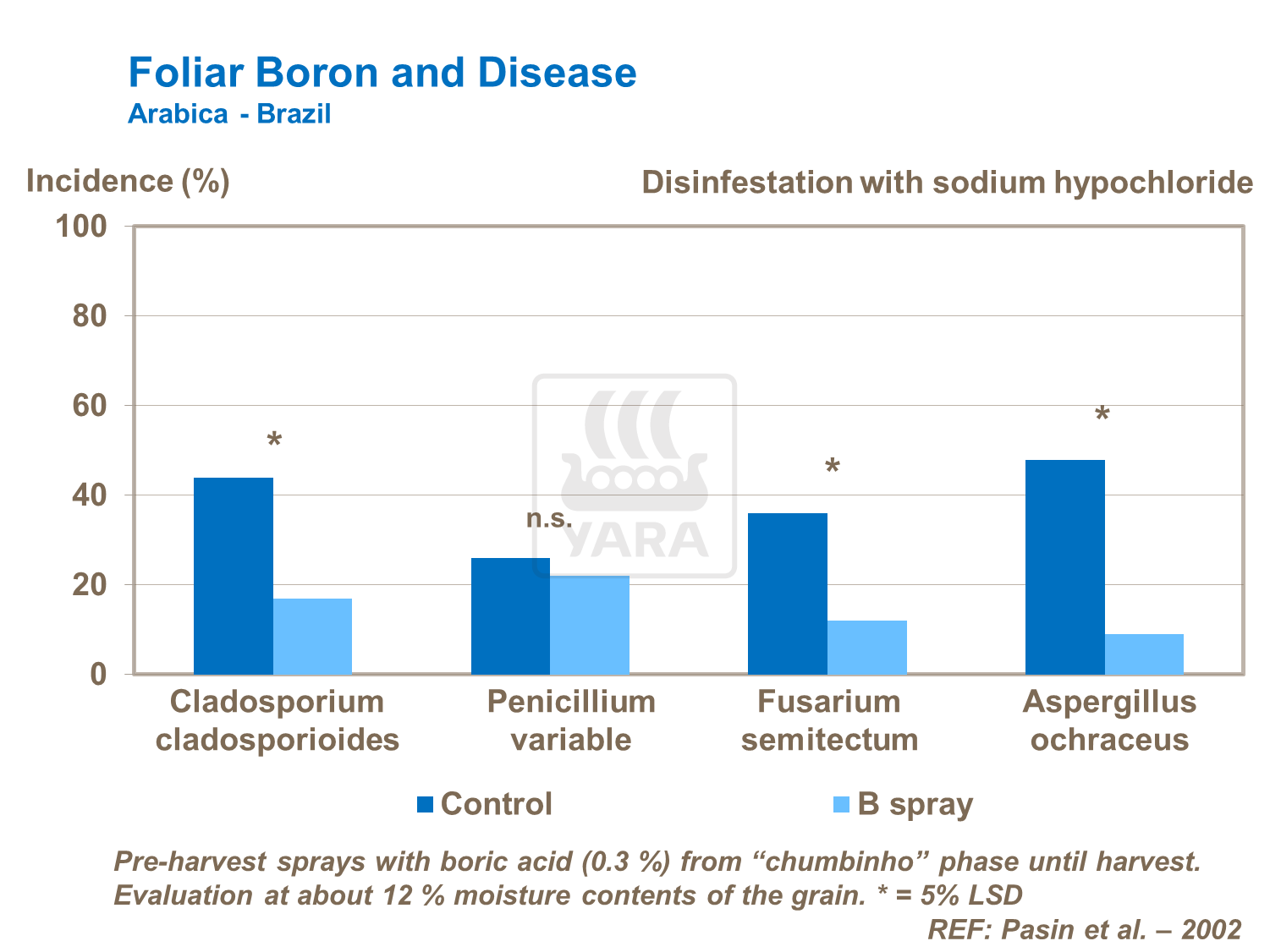 Pre-harvest sprays of boron can reduce the impact of a range of fungal diseases on the processed coffee bean – with or without the added disinfection provided by using sodium hypochloride.