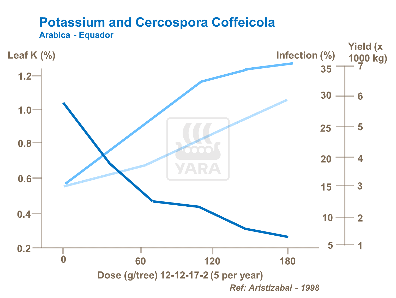 In Ecuadorian trials, Potassium is used to improve levels of the element in leaf tissue, which has been shown to minimize brown eye spot, Cercospora coffeicola, which can defoliate trees and lead to beans that are unmarketable and impossible to pulp.