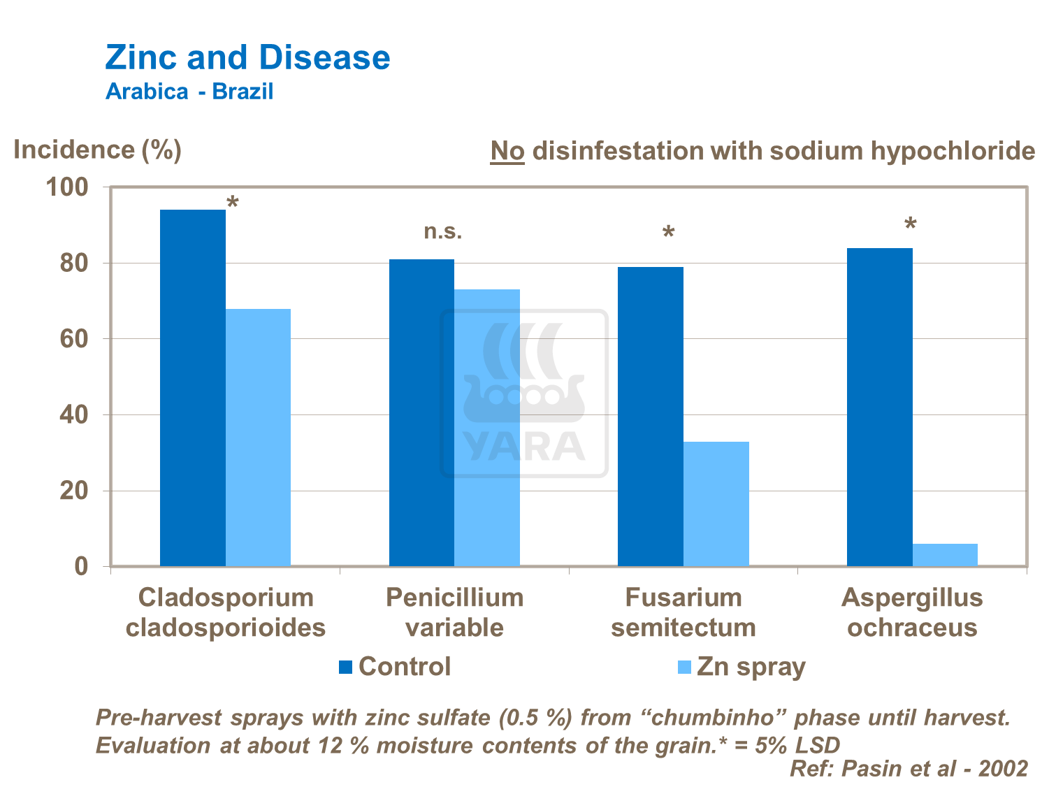 The widespread use of copper based fungicides means that copper deficiencies are rarely seen. Trials show that copper fungicides can supply amounts of copper at levels well above the 20-25ppm copper considered optimum for coffee production. One of the key benefits of a regular spray application program is the reduced incidence of fungal diseases in processed coffee grains.