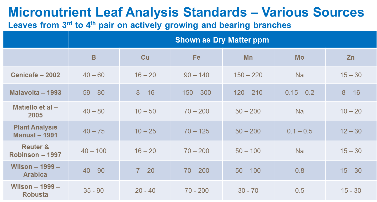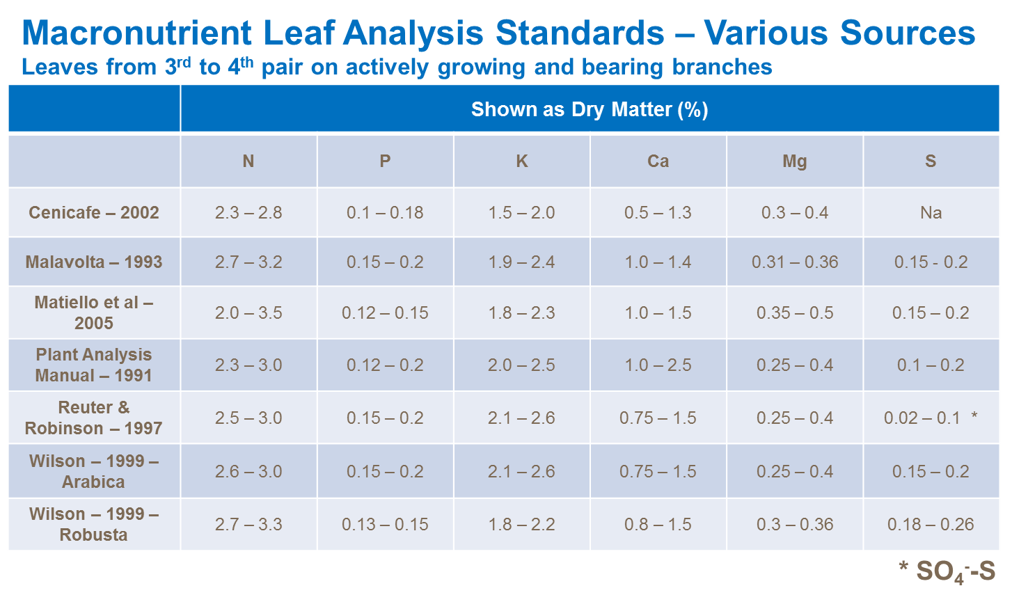 In practice, the third and fourth leaf pairs down from the tip on an active primary branch, from a bearing crop, are most commonly sampled. Samples should consist of around 100 leaves selected in random from around 40 trees within the same 2-4ha block. Tables 1 and 2 give nutrient standards for macro and micro-nutrients based on plant tissue analyses.