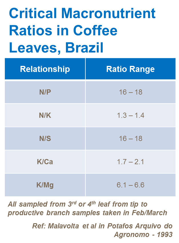Soil and leaf tissue analyses should also be used to assess nutrient imbalances. Where the critical values for any one of potassium, magnesium and calcium are exceeded, then uptake of other cations can be affected. For example, productive growth occurs when the K:Ca ratio in the leaf is around 1.7-2.1. Nutrient ratio tables can be an important guide to ensure nutrients are well balanced, but they should not be used as the main determinant for fertilizer rate.