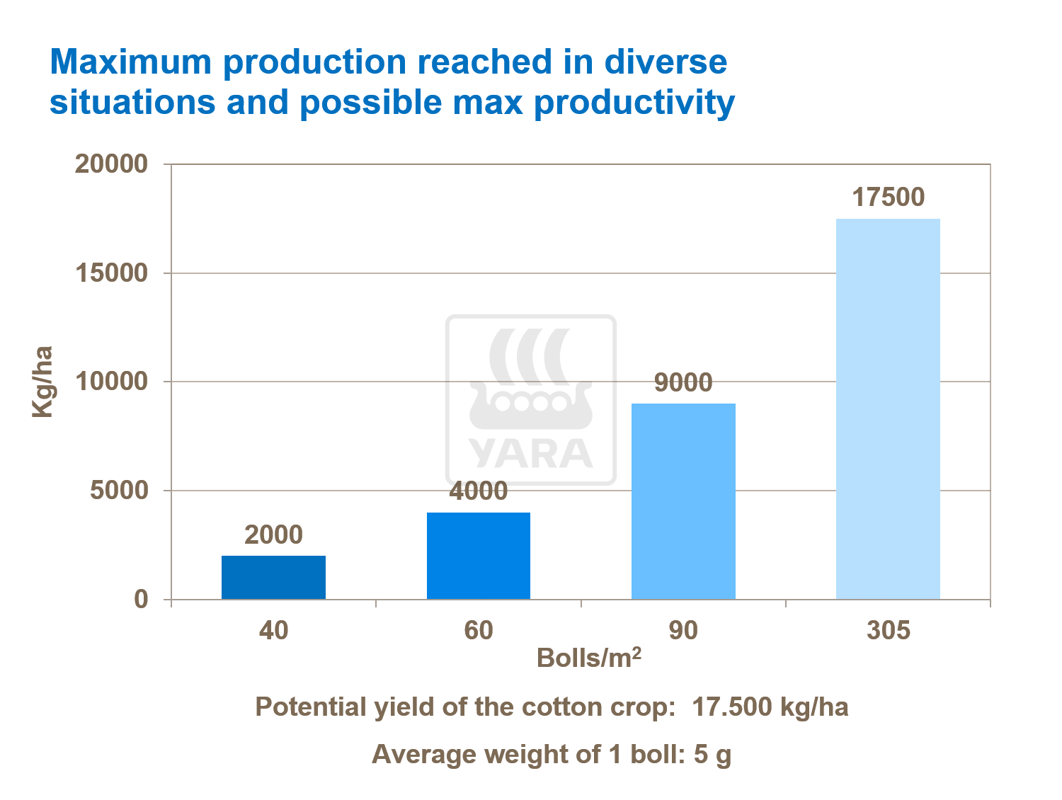 Nitrogen prolongs the plant’s growth and increases the number of bolls set. Nitrogen can also increase boll size (weight of seed cotton per boll). This effect is relatively smaller than effect on boll number and usually occurs through an increase in individual seed weight at the expense of lint percentage.