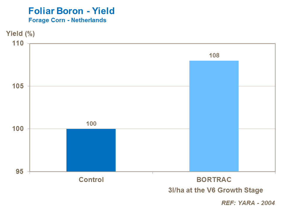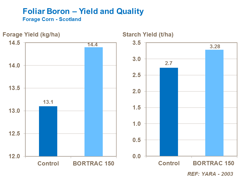 There is evidence that boron increases the yield and starch content of forage maize. Foliar applications made at the V5 or V6 stage, when there is significant leaf cover, will improve forage maize yields in deficient crops.