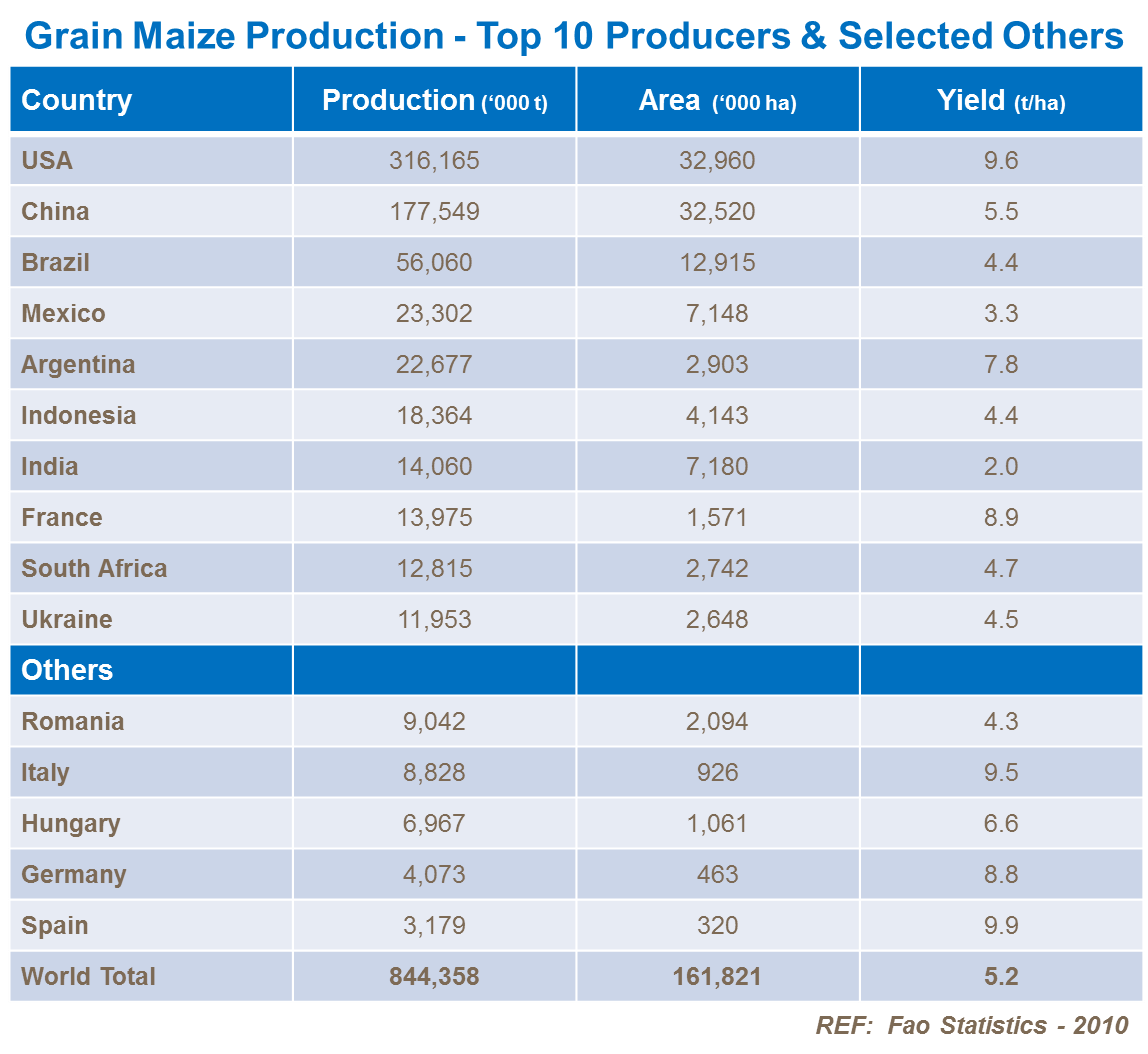 Approximately two-thirds of world maize production is grown for animal feed. Most is harvested once fully ripe for grain used in animal feed with yields in some countries averaging nearly 10t/ha. Both grain and forage maize provide one of the highest sources of energy for feeding to livestock, providing more oil than wheat and barley, but a lower protein content than that found in cereal grains.