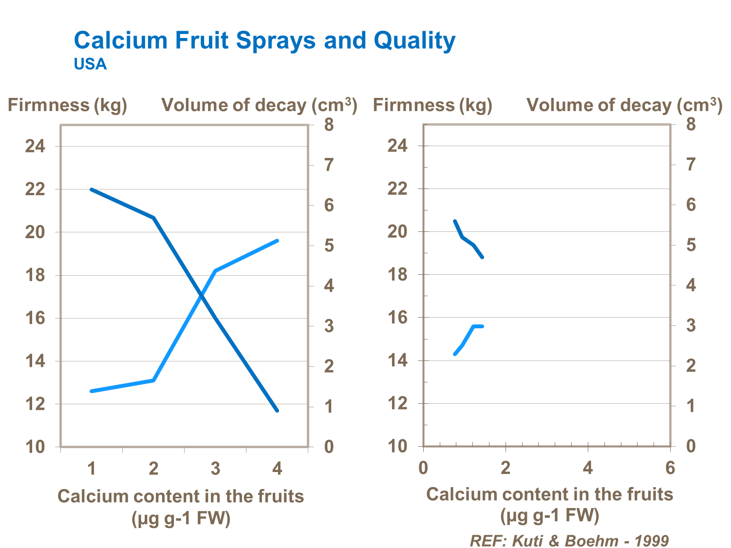 Calcium availability is also critical during early fruit fill, in order to ensure good supplies find their way into the flesh and rind of the fruit. It is common practice to use applications throughout the growing season right through to early fruit maturation to build-up levels in crop tissue, maximizing quality potential and storability.