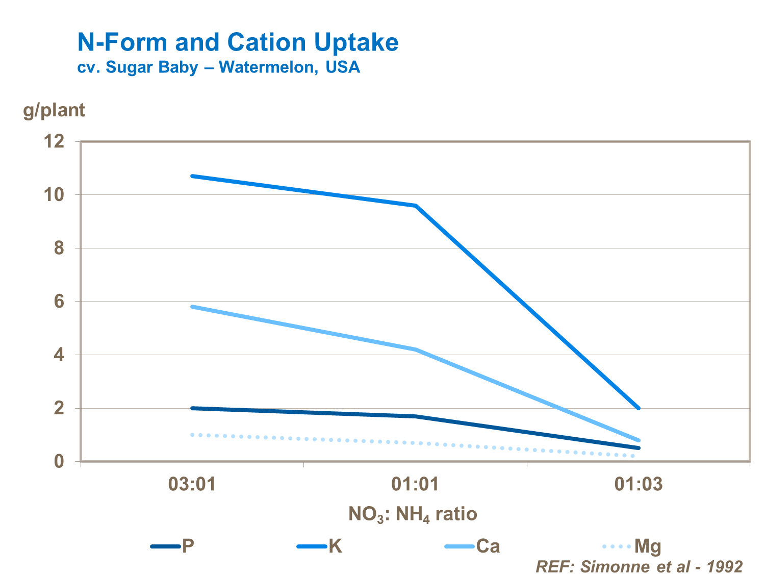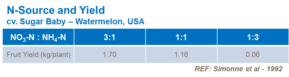 Nitrogen form is critical to maintain a good balance between ammonium and nitrate forms to maintain fast growth and good crop productivity. Trials confirm significant reductions in N-uptake by leaves and yield losses from use of fertilizers with a too high proportion of ammonium compared to nitrate (cv. Sugar Baby - Watermelon, USA).