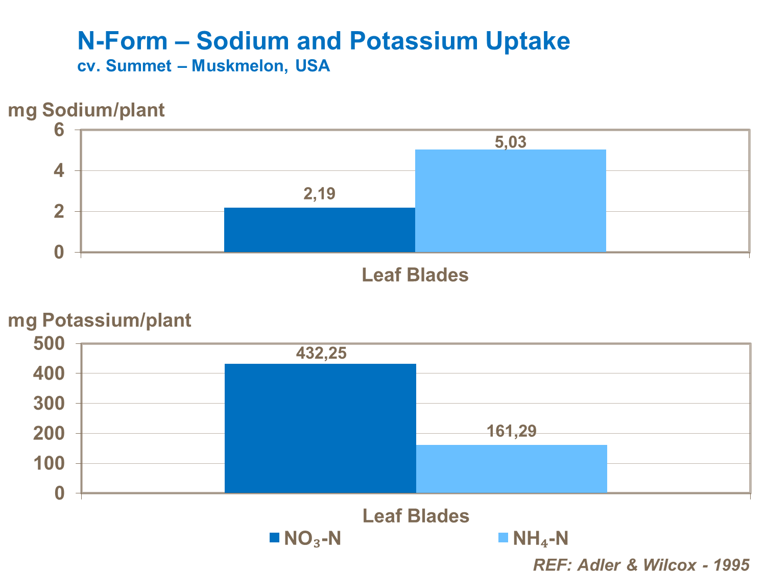 Under saline conditions, nitrate-N tends to limit sodium uptake and ammonium- N tends to favor greater uptake of sodium. This in turn reduces the uptake of ions such as potassium (cv. Summet - Muskmelon, USA).