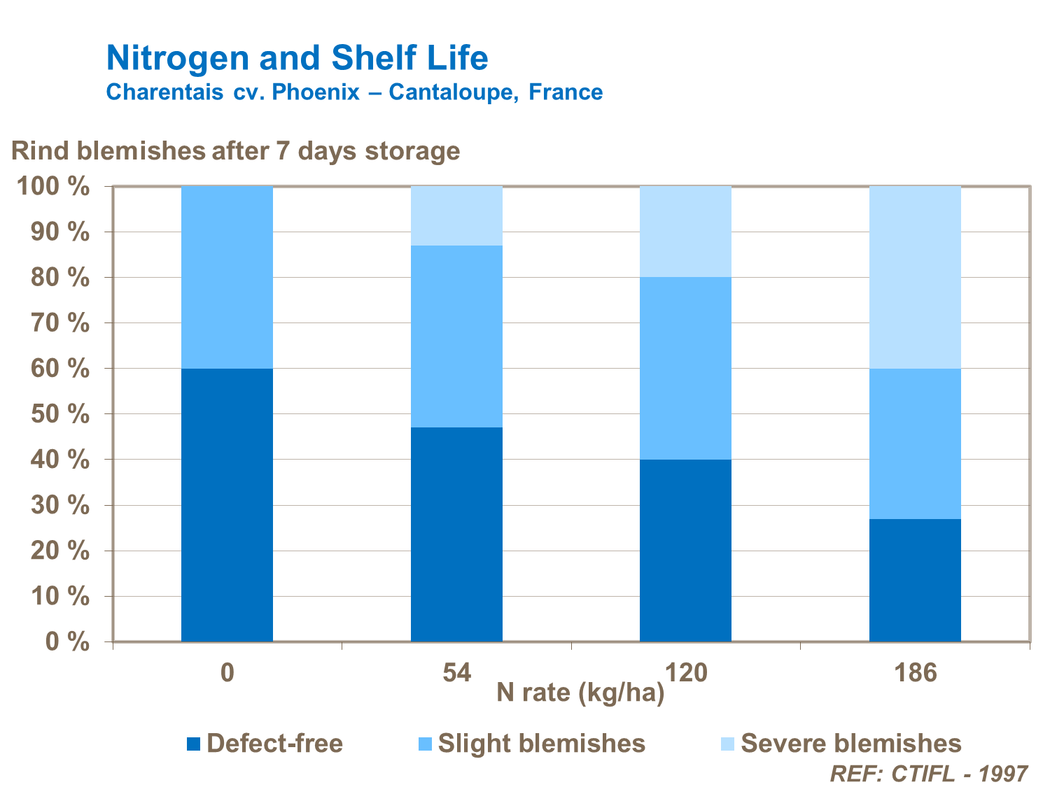Too much nitrogen at later stages of growth can spoil fruit quality by increasing the level of blemish on the rind and encouraging fruit rot. Thus, it is important to confirm rates and timing following local trials that take into account the need for high yield, but also good quality fruit (Charentais cv. Phoenix - Cantaloupe, France).