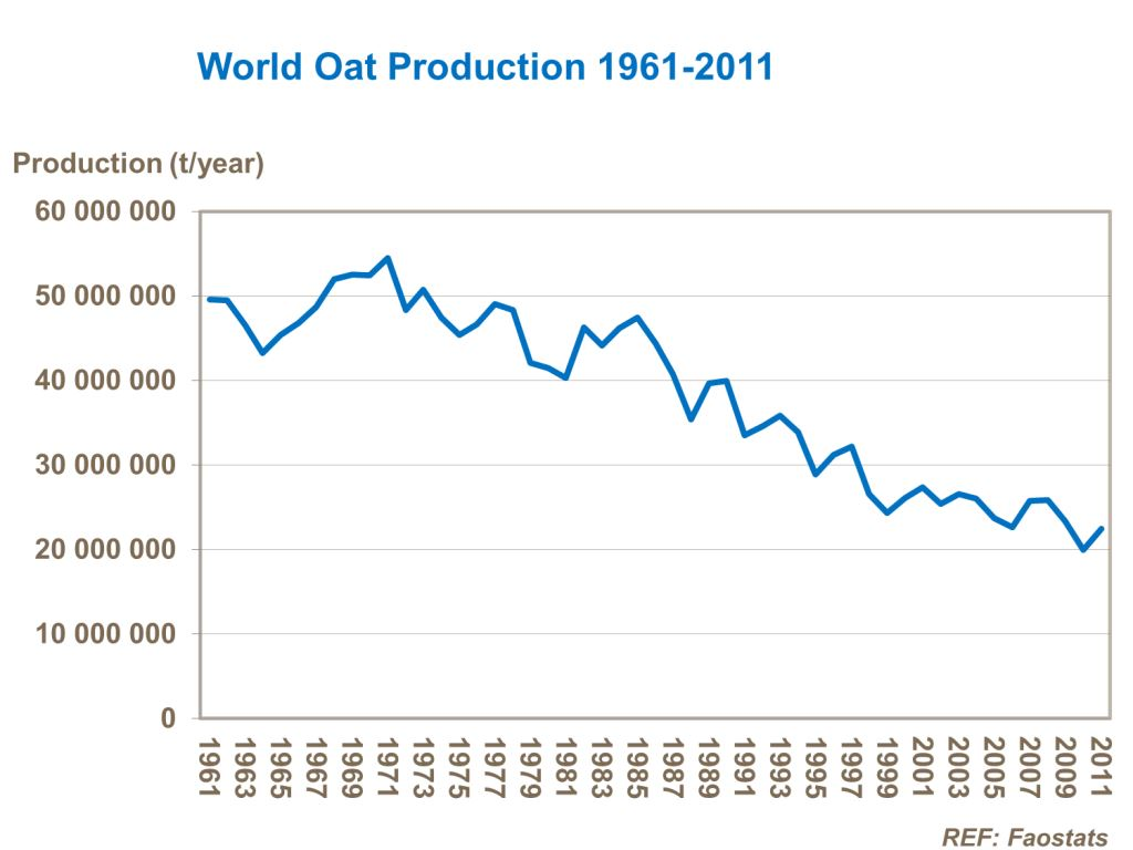 The annual global production of oats is about 22.5 million tons harvested off 9.7 million hectares. World oat production has decreased over the last few decades, and is now at 45% of the 1961 production figure.