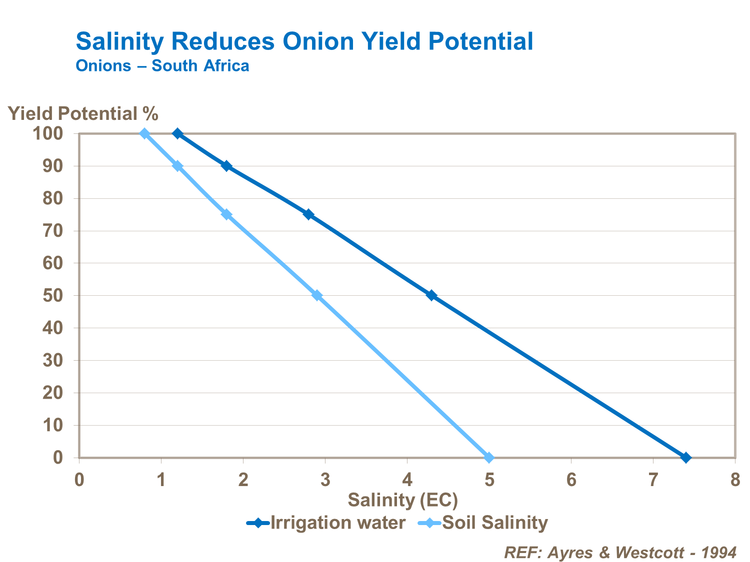 Onions are very sensitive to salinity and so saline soils and salty irrigation water should be avoided.