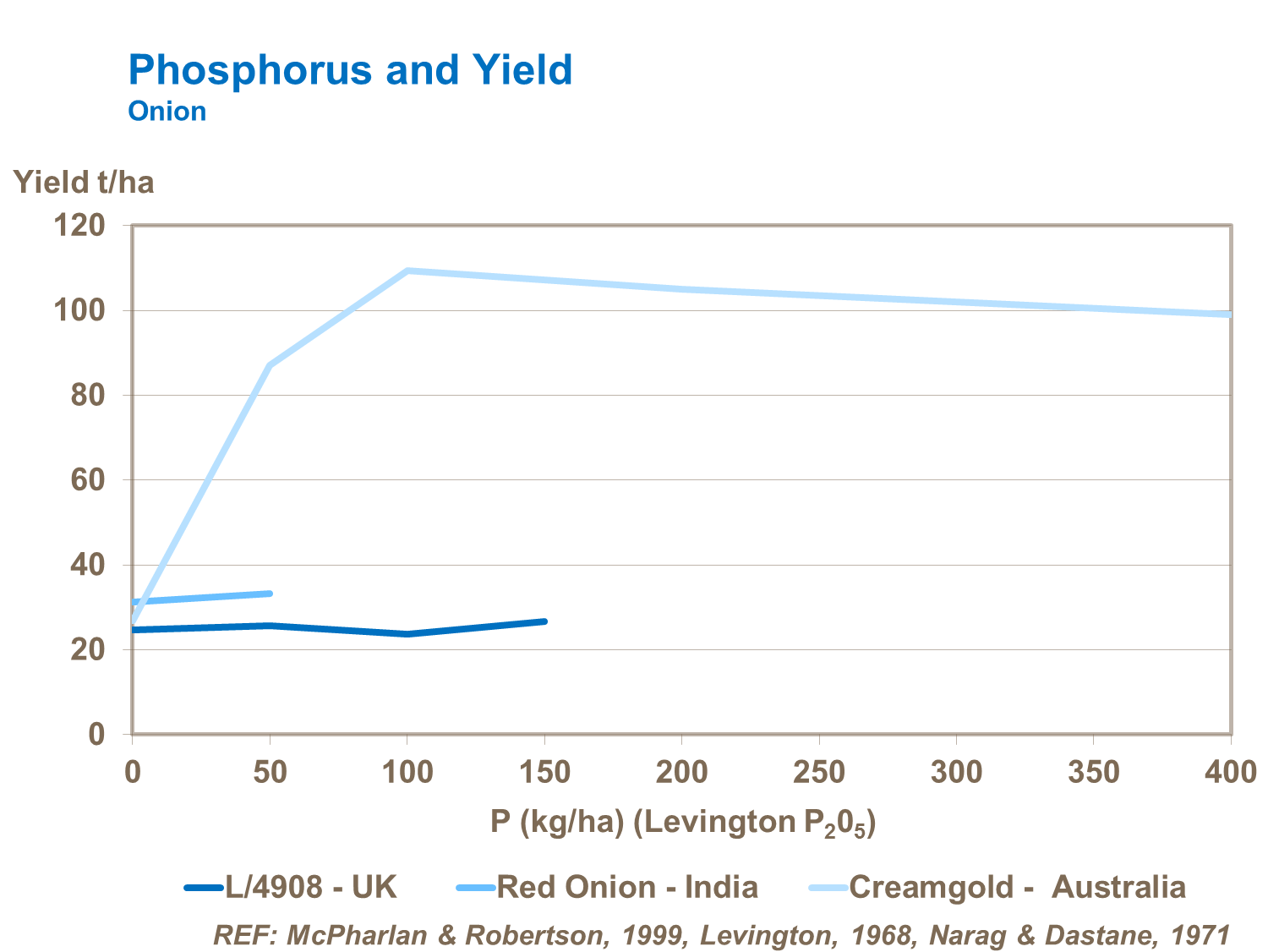 Phosphorus is rarely required in large quantities. However, where crops are grown on soils with very low natural P levels, higher rates are required to boost yield and bulb size. It is important that phosphorus is available early season in order to encourage growth, particularly of the root system. Placement of phosphorus within the root zone has been shown to work better than when P-fertilizer is broadcast.