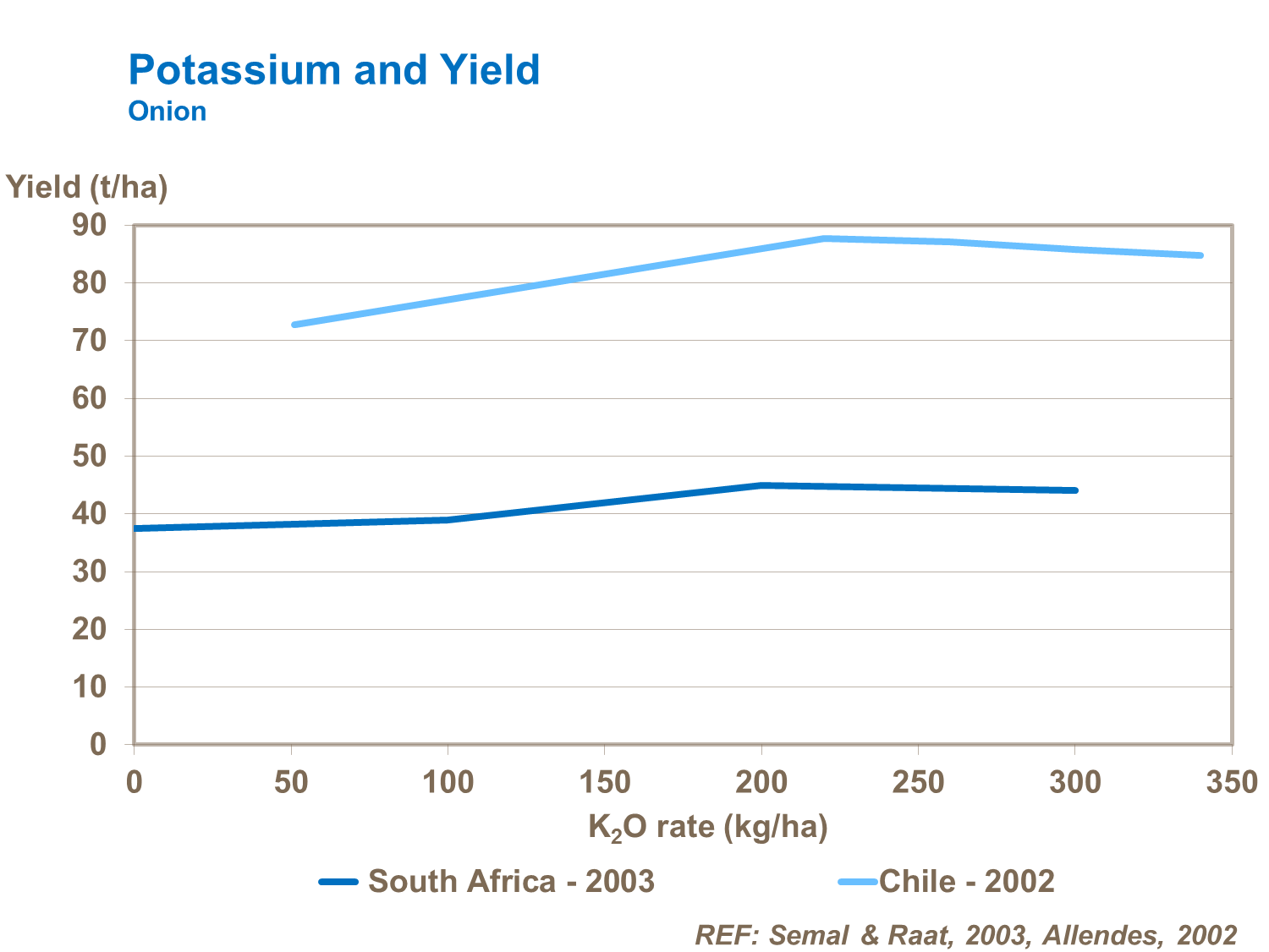 Potassium is particularly important where high N rates have been applied, as trials in Australia show. In these situations it helps maintain yield by increasing dry matter and sugar accumulation in the bulb.