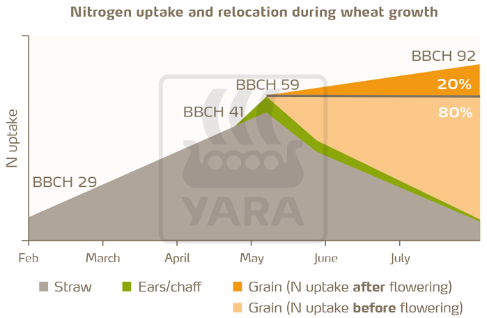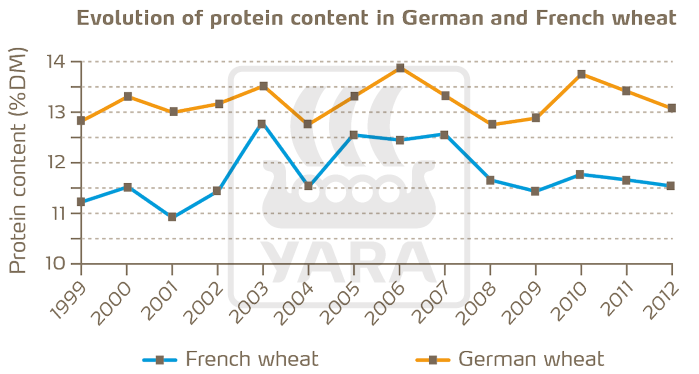 Proteins build up in the grain at the end of the vegetation cycle. The protein content in the wheat grain is dependent on genotype but is also clearly influenced by environmental variables such as water access and temperature during growth especially through the grain filling period. The most effective environmental factor on wheat quality, however, is nitrogen supply. Proper management of nitrogen fertilizer ensures high quality wheat.