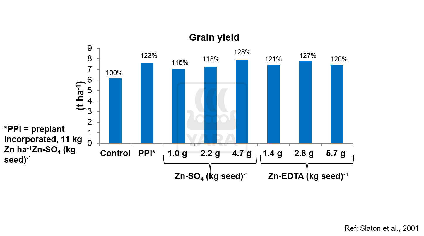 The grain yield was significantly improved by the use of Zn seed treatment compared with the control and was equal to the yield from the standard recommendation in the US of 11 kg Zn ha-1 PPI. (Slaton et al. 2001).