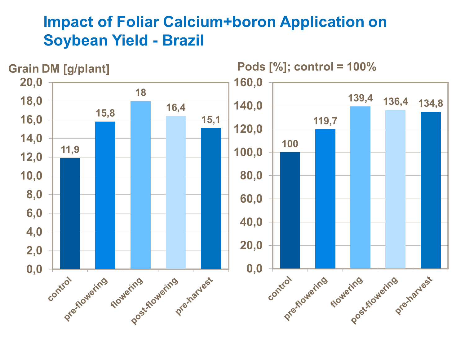 Boron deficiency causes malformation of the pollen tube and results in increase on flower abortion, then reducing soybean yield potential. Therefore, boron supply is essential to obtain high yields.