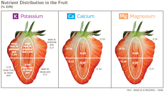 The figure above also shows the distribution of selected nutrients within various sections of the fruit. In this trial, the fruit was divided into proximal and distal parts and each of them separated into inner and outer part of fruit. The berry peel was removed and not tested.