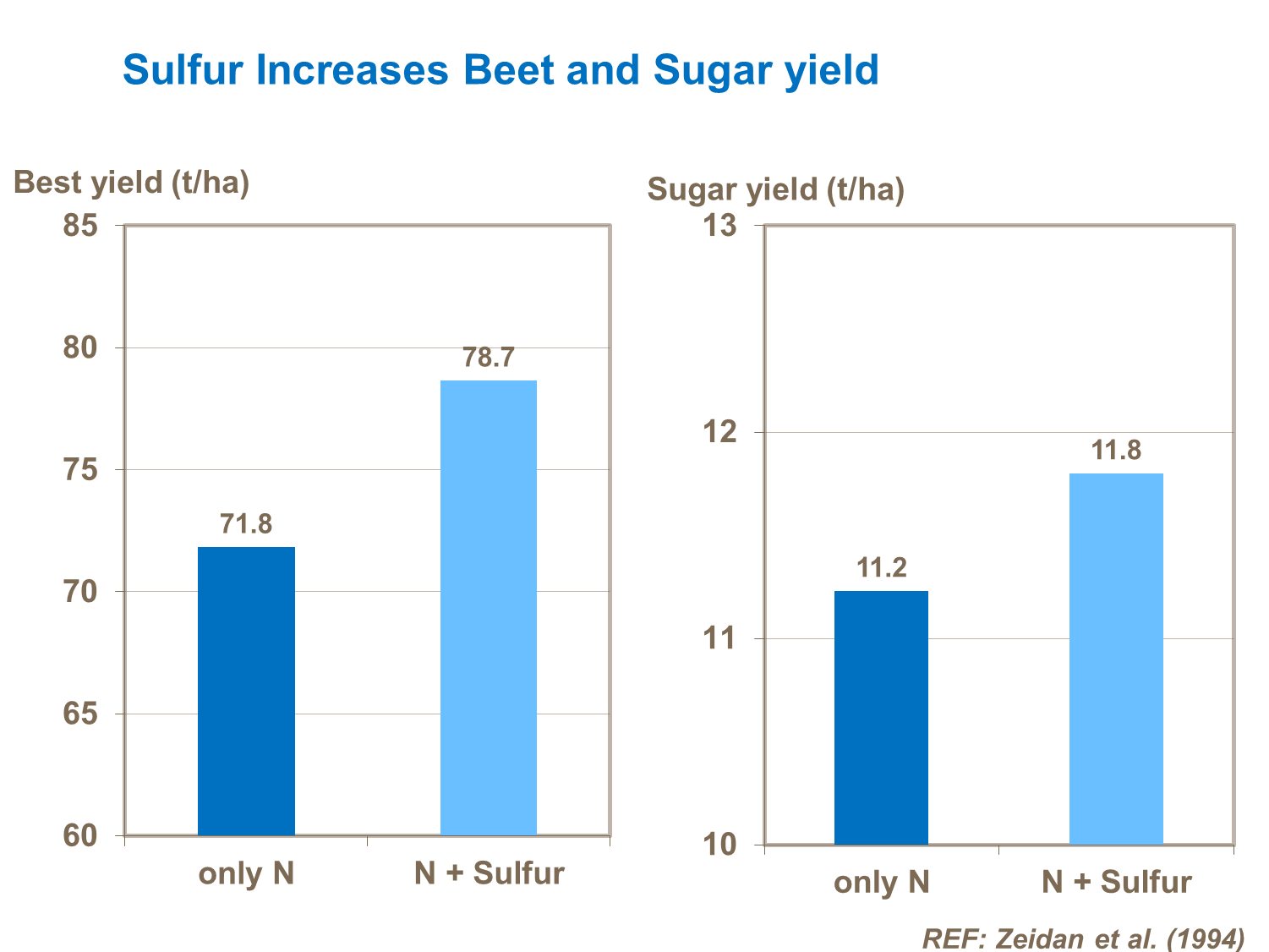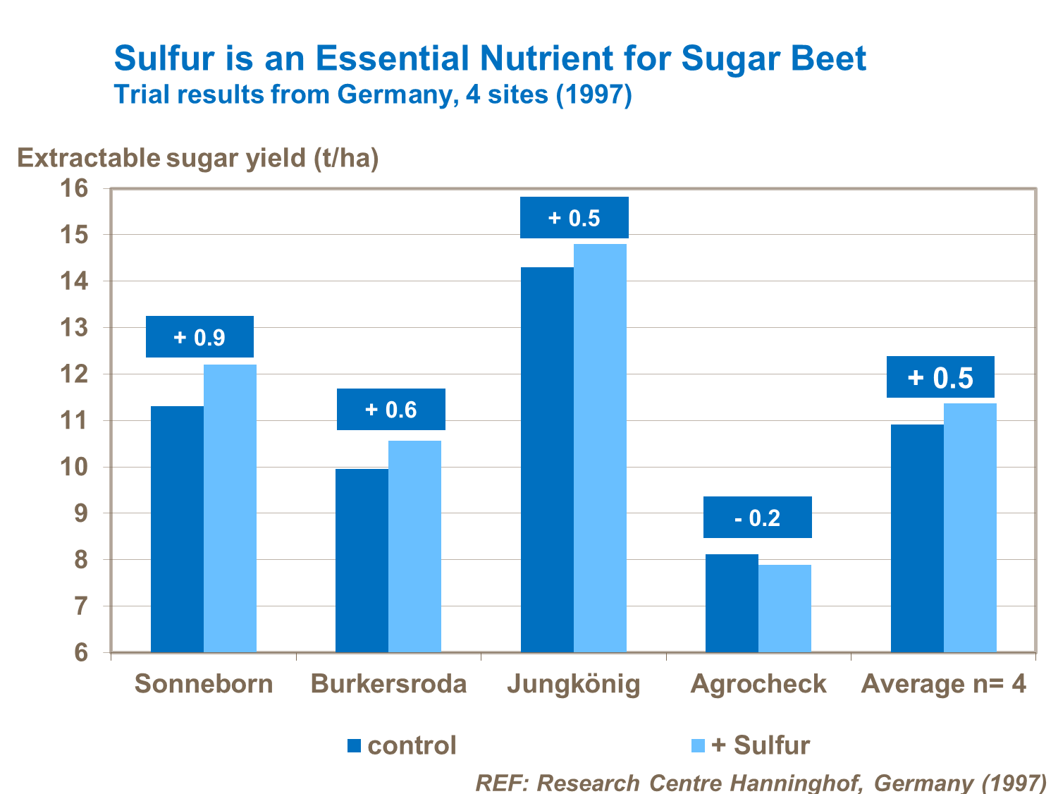 Sulfur is an important component of all proteins and enzymes, and with the protein in greatest quantity being chlorophyll, deficiency can severely reduce yield. The sulfur uptake of a 50 t/ha sugar beet crop is approximate 32 kg S/ha, with 14 kg/ha in the leaves and 18 kg/ha in the roots.