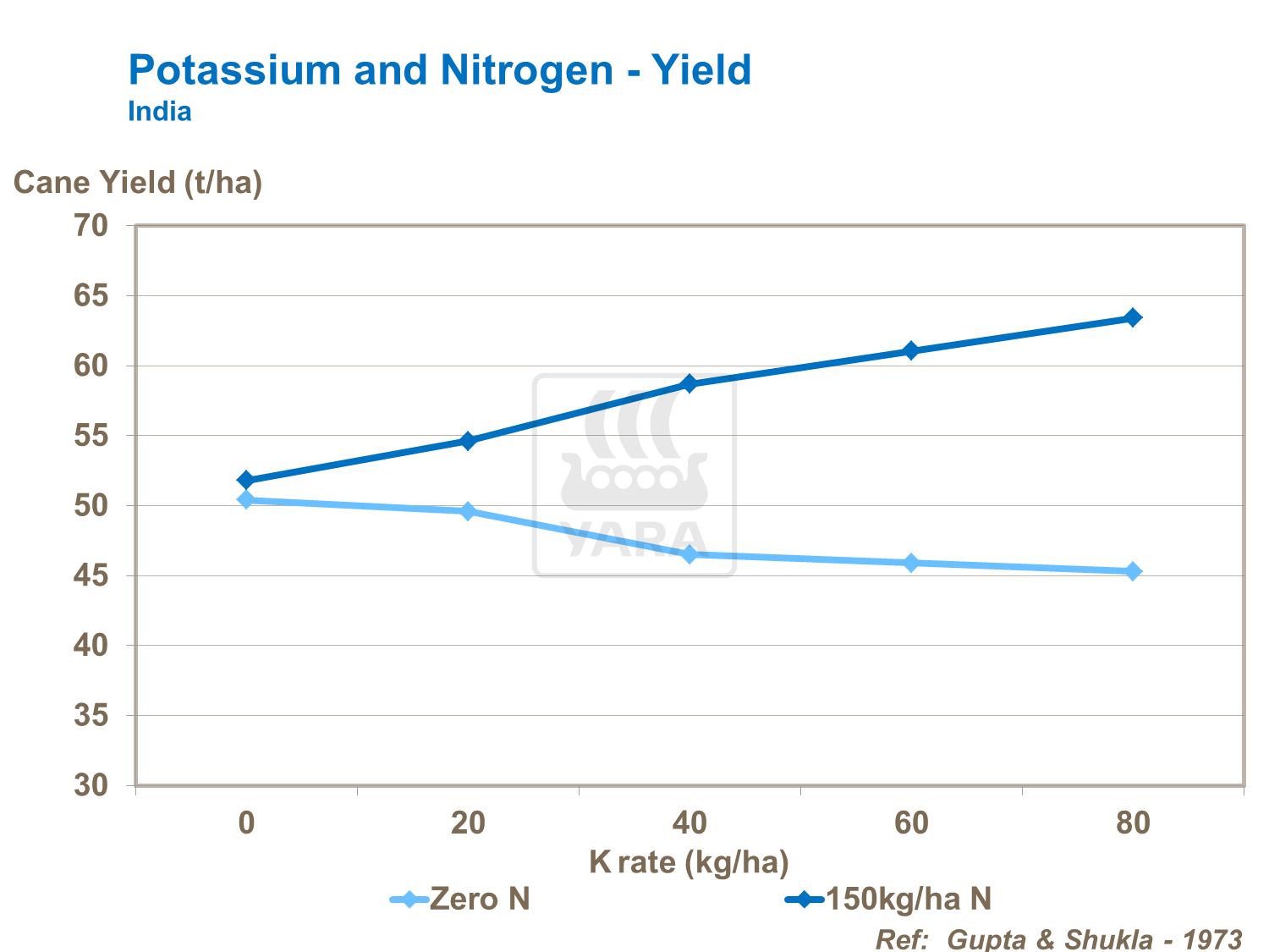 Potassium aids photosynthesis and so is important to productive growth, stronger stalk development with less lodging. Thus like nitrogen, K also boosts strong cane development, long internode growth, wider cane girths and sugarcane yield. Potassium and nitrogen need to be in balance. While N responses can be small, use of potassium alongside N ensures better yields of cane.