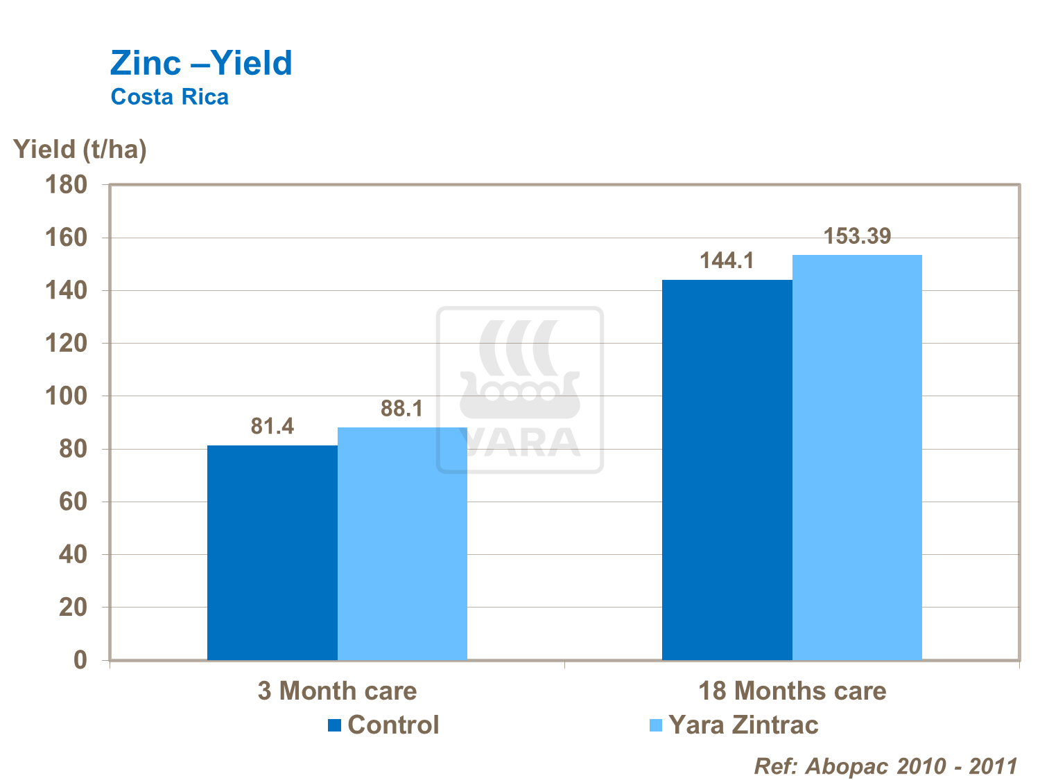 Of all the micronutrients, zinc provides the largest response in the greatest number of trials. Peak demand of zinc is during establishment and tillering, hence the strong responses seen to zinc applied impregnated on the set or directly applied to the furrow. However, high yield responses also come from foliar zinc applied to the leaf on each subsequent ratoon crop. This is largely due to its effect on early root and shoot growth and the subsequent increase in tiller numbers leading to significant yield increases in the plant and following ratoon crops. Best effects are seen where zinc is applied alongside boron.