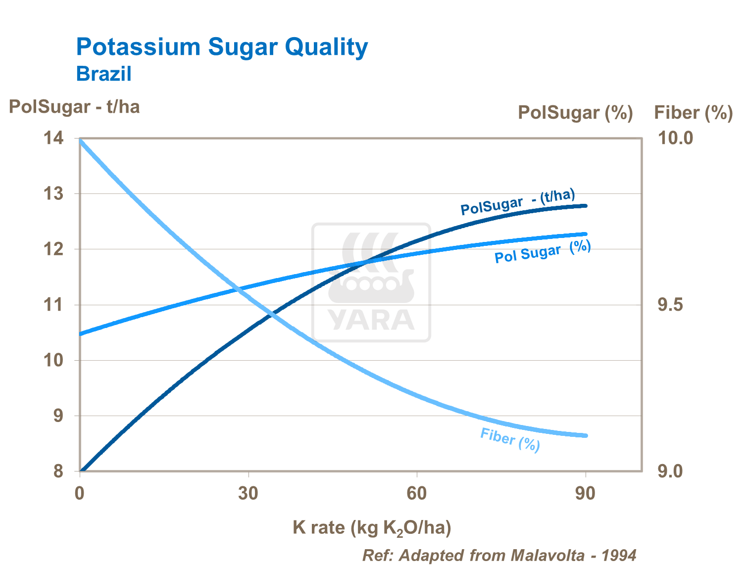 Potassium has a key role to play in sugar synthesis and its translocation to the cane. It also improves sugar quality increasing Pol and Brix levels and reducing fiber content. An adequate potassium supply also ensures a higher sugar yield. Luxury uptake though, adversely affects sugar crystallization.