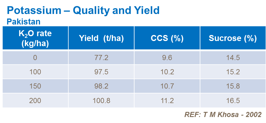 Potassium has a key role to play in sugar synthesis and its translocation to the cane. Potassium improves sugar quality by increasing Pol and Brix leves.