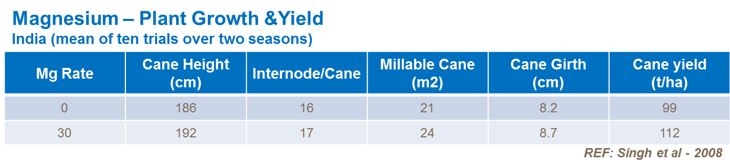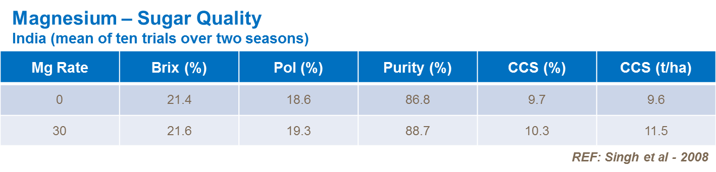 Magnesium supply helps maintain sucrose content in the cane by boosting protein synthesis. Sugar is also influenced by magnesium supply and sucrose content is reduced where magnesium nutrition is inadequate.