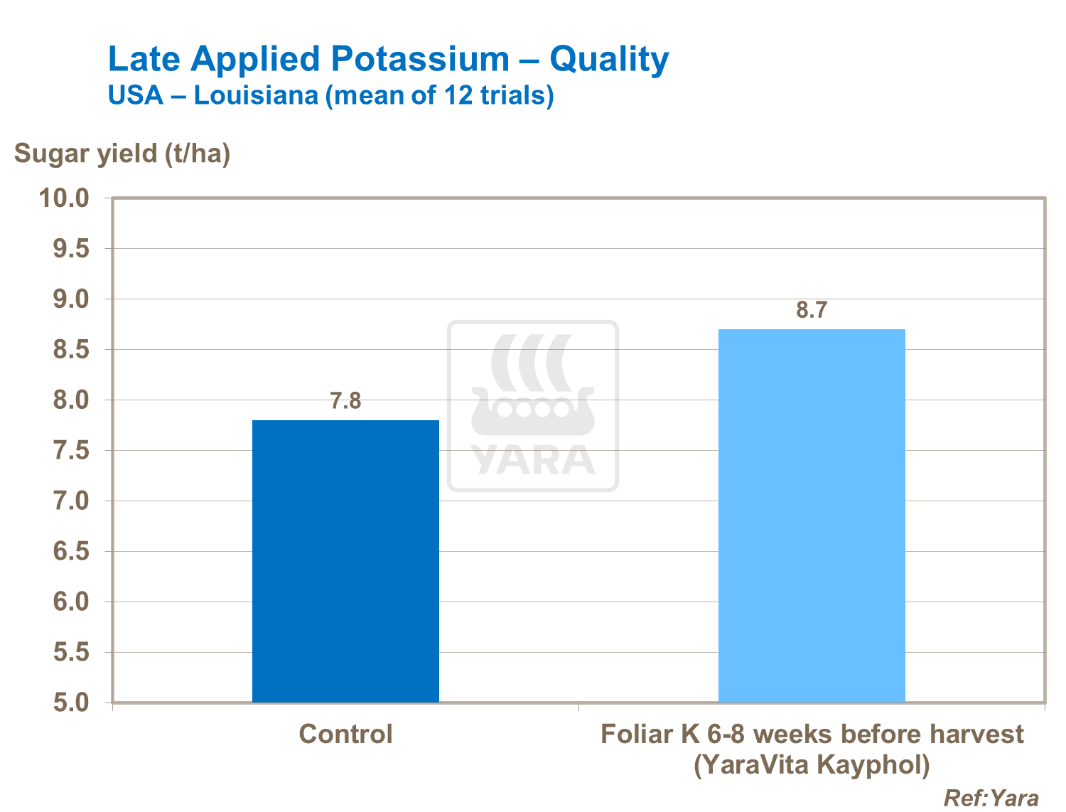In trials with foliar potassium applied to the plant 6-8 weeks prior to harvest, the researchers also reported a 15.1% increase in °Brix, an increase in POL of 20% and a reduction in cane fiber of 28%. It is also important to have sufficient potassium available to utilize the assimilated nitrogen in the cane to bring about good crop maturity and ensure that reducing sugars are converted to sucrose.