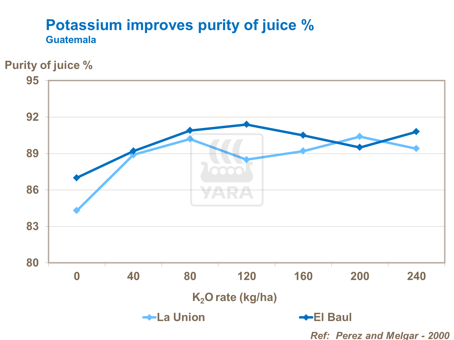 Potassium has a key role to play in sugar synthesis and its translocation to the cane. It also improves sugar quality increasing Pol and Brix levels and reducing fiber content. Luxury uptake though, adversely affects sugar crystallization. Potassium improves juice purity, it is also important to balance nitrogen use with potassium, to maximize sugar conversion, content and juice quality. Late nitrogen application can reduce sugar purity, color and clarification.