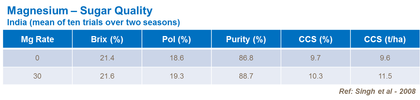 Magnesium supply helps maintain sucrose content in the cane by boosting protein synthesis while improving juice quality.